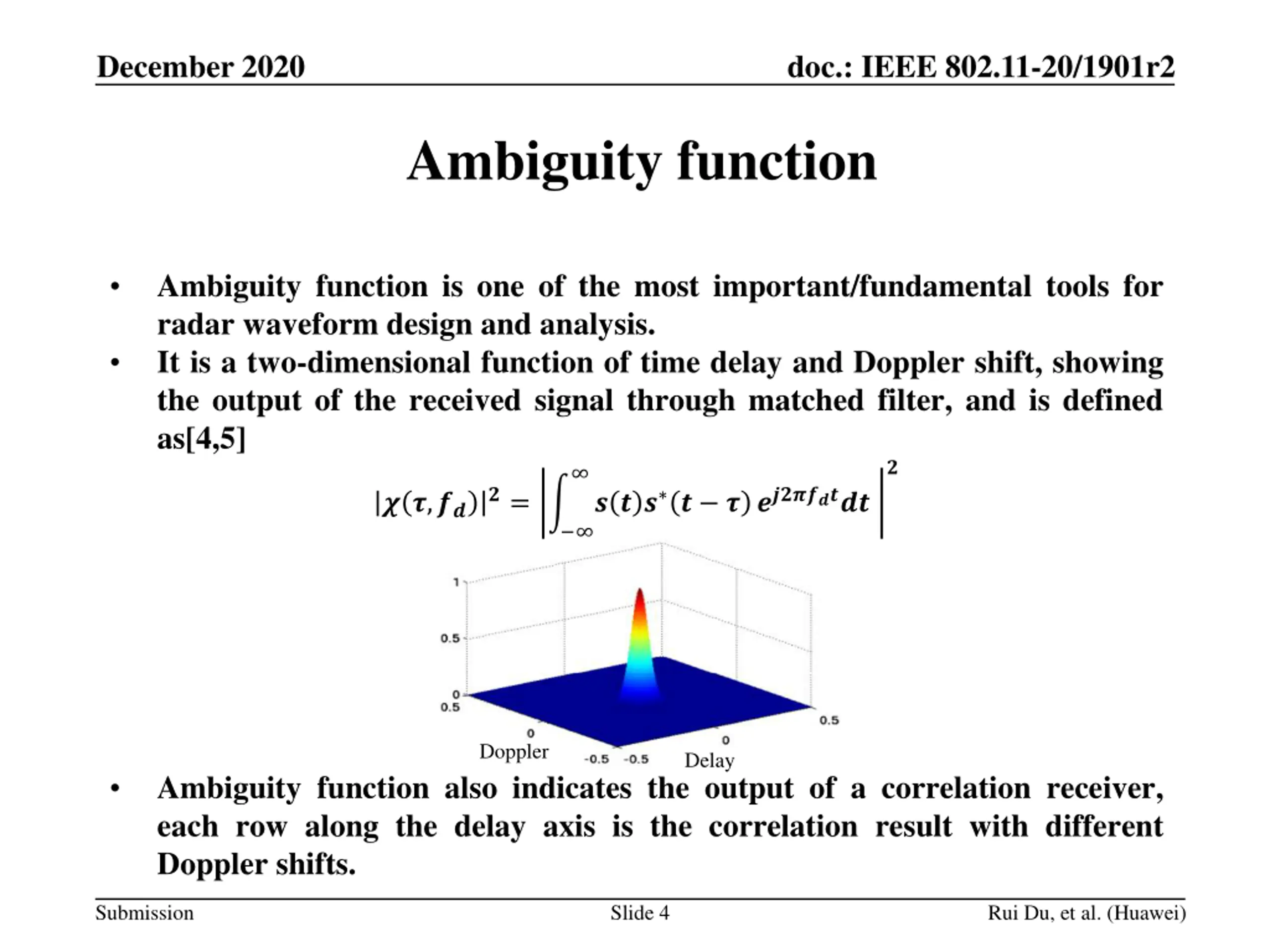 December 2020 doc.: IEEE 802.11-20/1901r2 Ambiguity function Ambiguity function is one of the most important/fundamental tools for radar waveform design and analysis. It is a two-dimensional function of time delay and Doppler shift, showing the output of the received signal through matched filter, and is defined as[4,5] ? ? ? ? ? ????????? ? ?= ? ?,?? Doppler Delay Ambiguity function also indicates the output of a correlation receiver, each row along the delay axis is the correlation result with different Doppler shifts. Submission Slide 4 Rui Du, et al. (Huawei)