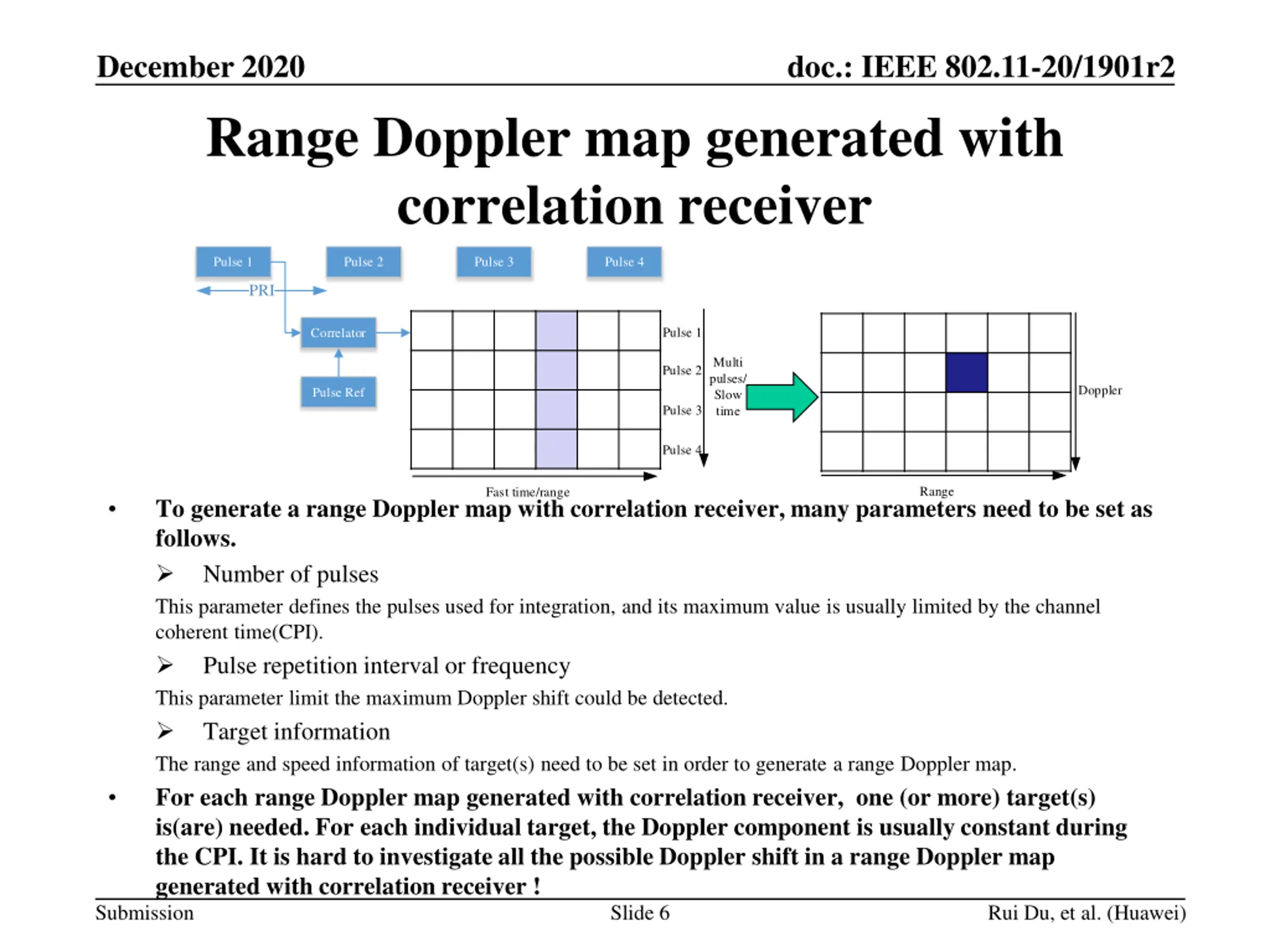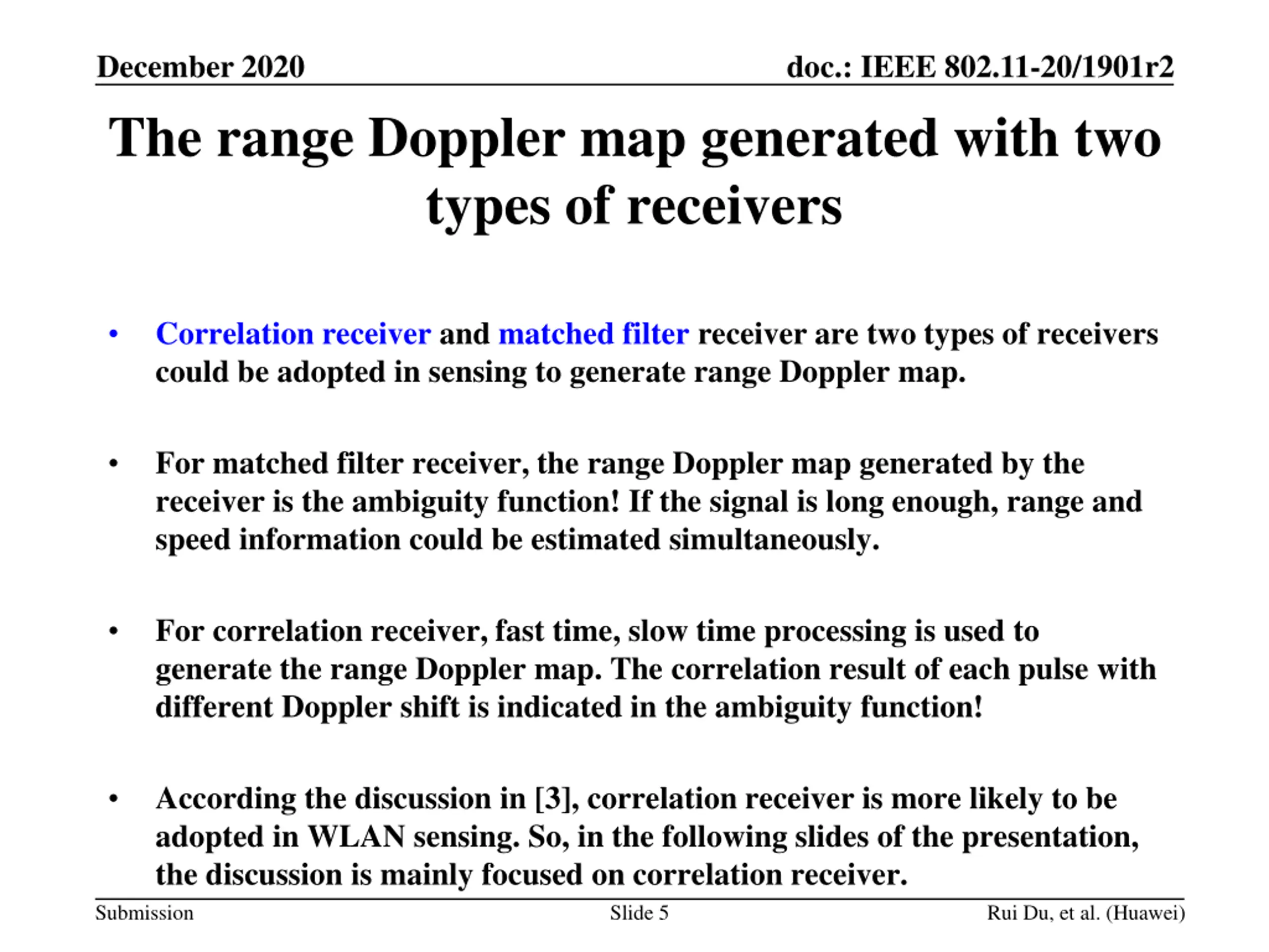 December 2020 doc.: IEEE 802.11-20/1901r2 The range Doppler map generated with two types of receivers Correlation receiver and matched filter receiver are two types of receivers could be adopted in sensing to generate range Doppler map. For matched filter receiver, the range Doppler map generated by the receiver is the ambiguity function! If the signal is long enough, range and speed information could be estimated simultaneously. For correlation receiver, fast time, slow time processing is used to generate the range Doppler map. The correlation result of each pulse with different Doppler shift is indicated in the ambiguity function! According the discussion in [3], correlation receiver is more likely to be adopted in WLAN sensing. So, in the following slides of the presentation, the discussion is mainly focused on correlation receiver. Slide 5 Submission Rui Du, et al. (Huawei)