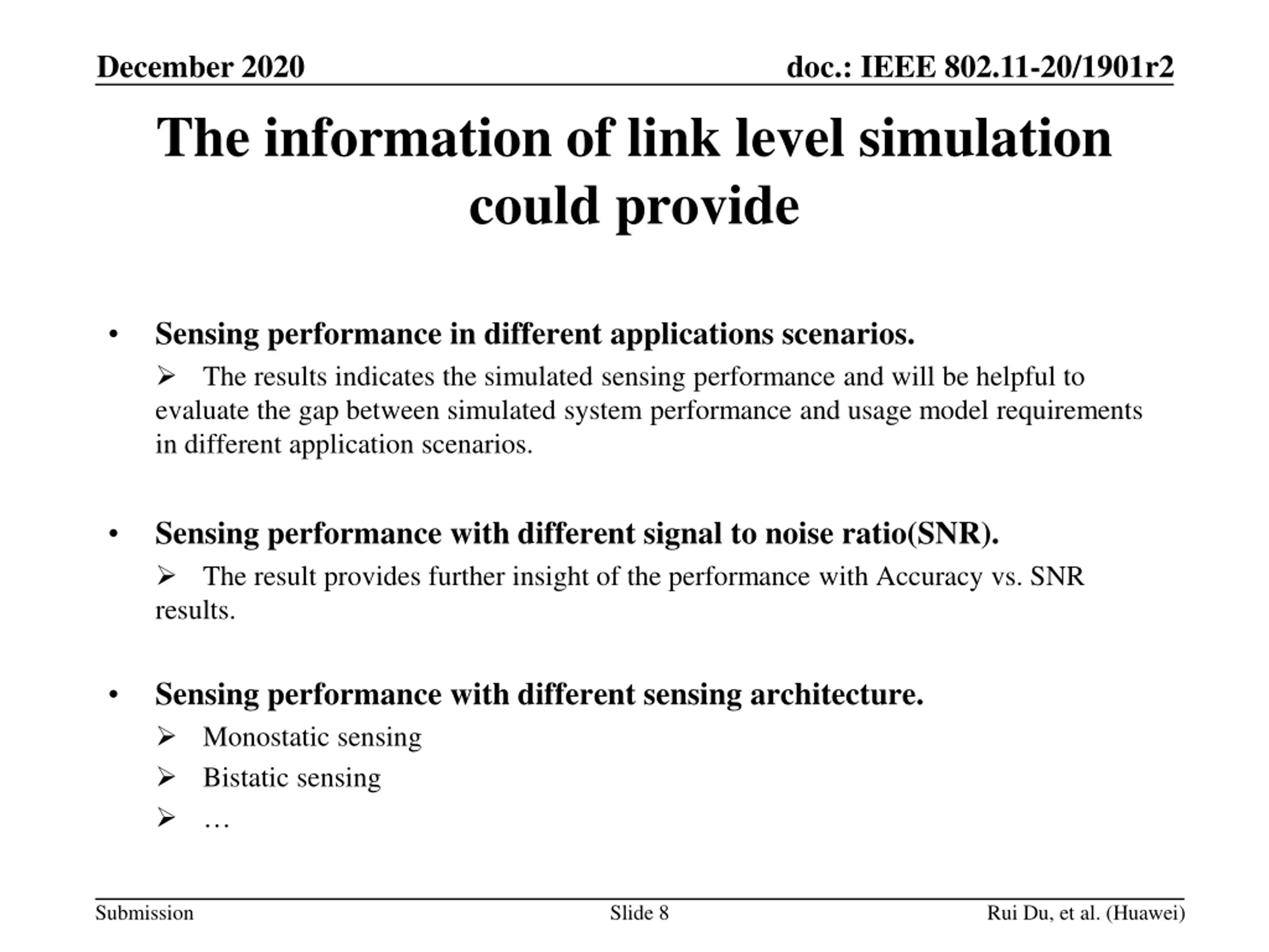 December 2020 doc.: IEEE 802.11-20/1901r2 The information of link level simulation could provide Sensing performance in different applications scenarios. The results indicates the simulated sensing performance and will be helpful to evaluate the gap between simulated system performance and usage model requirements in different application scenarios. Sensing performance with different signal to noise ratio(SNR). The result provides further insight of the performance with Accuracy vs. SNR results. Sensing performance with different sensing architecture. Monostatic sensing Bistatic sensing Submission Slide 8 Rui Du, et al. (Huawei)