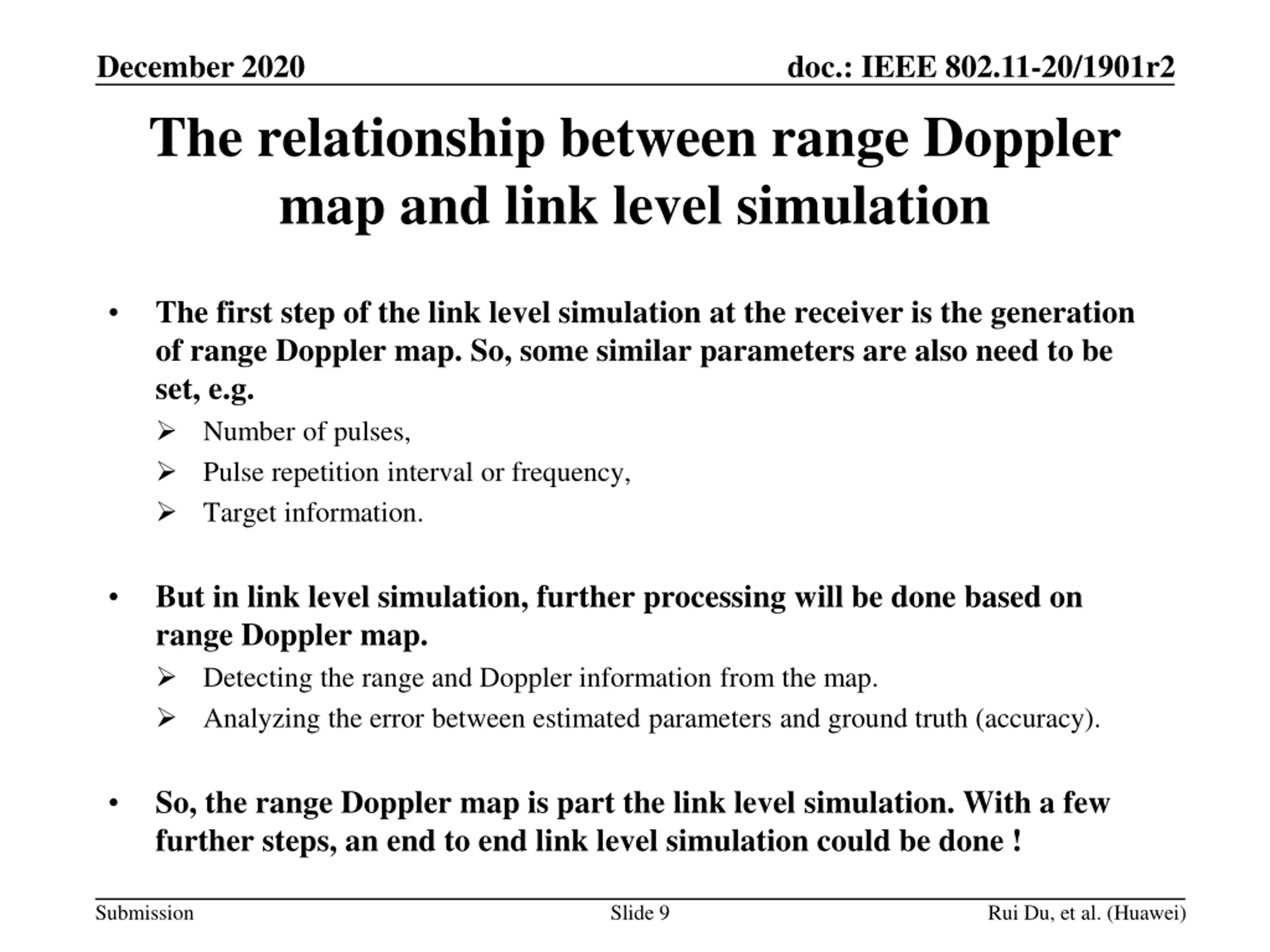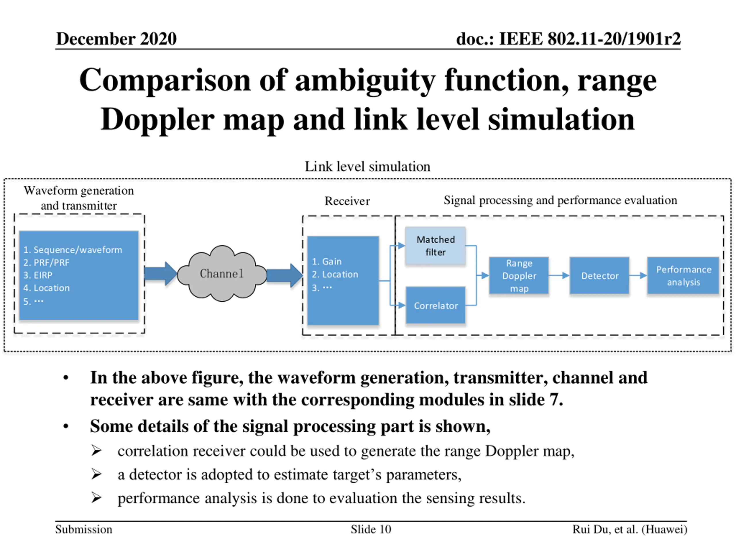 December 2020 doc.: IEEE 802.11-20/1901r2 The relationship between range Doppler map and link level simulation The first step of the link level simulation at the receiver is the generation of range Doppler map. So, some similar parameters are also need to be set, e.g. Number of pulses, Pulse repetition interval or frequency, Target information. But in link level simulation, further processing will be done based on range Doppler map. Detecting the range and Doppler information from the map. Analyzing the error between estimated parameters and ground truth (accuracy). So, the range Doppler map is part the link level simulation. With a few further steps, an end to end link level simulation could be done ! Submission Slide 9 Rui Du, et al. (Huawei)