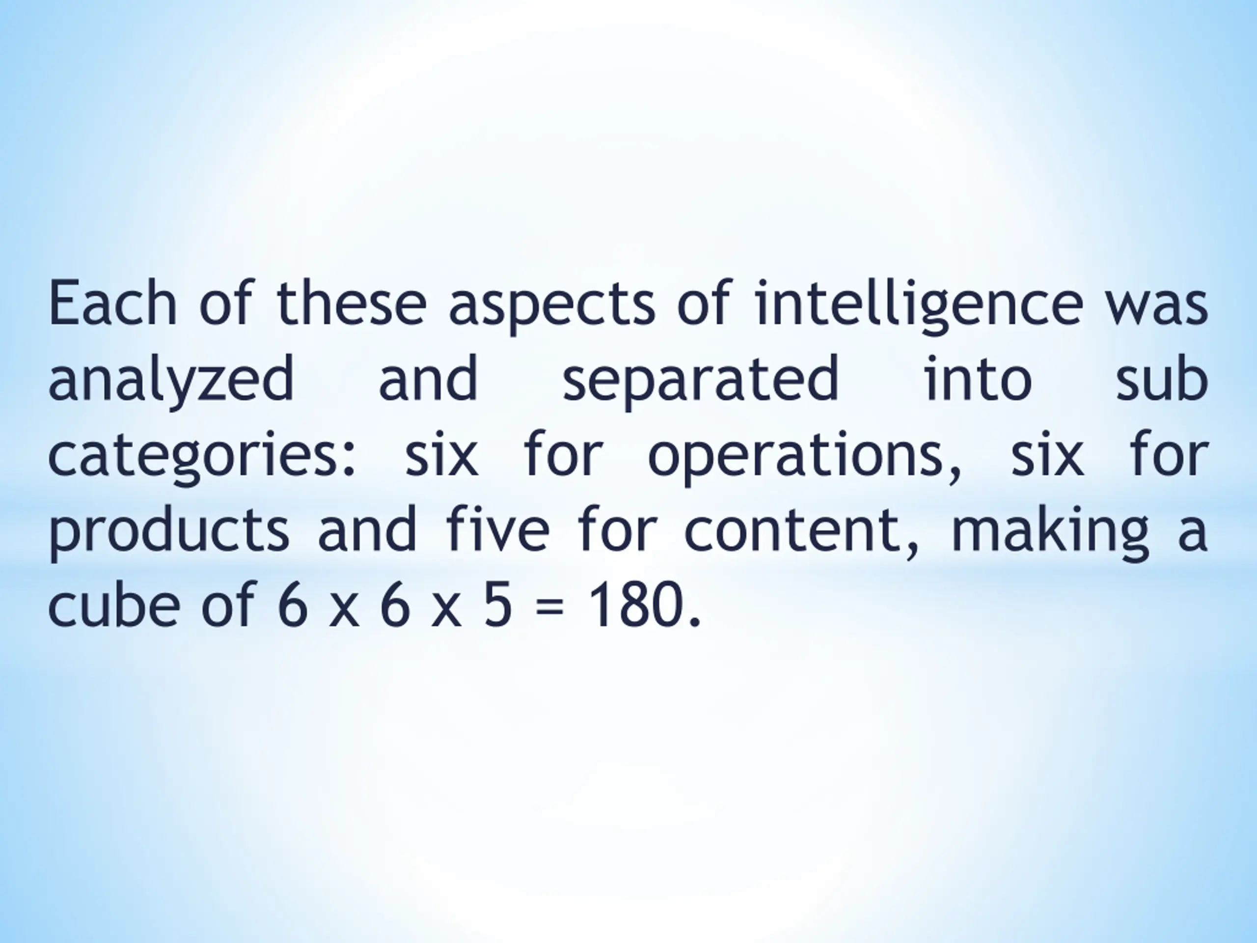 Each of these aspects of intelligence was analyzed and separated categories: six for operations, six for products and five for content, making a cube of 6 x 6 x 5 = 180. into sub