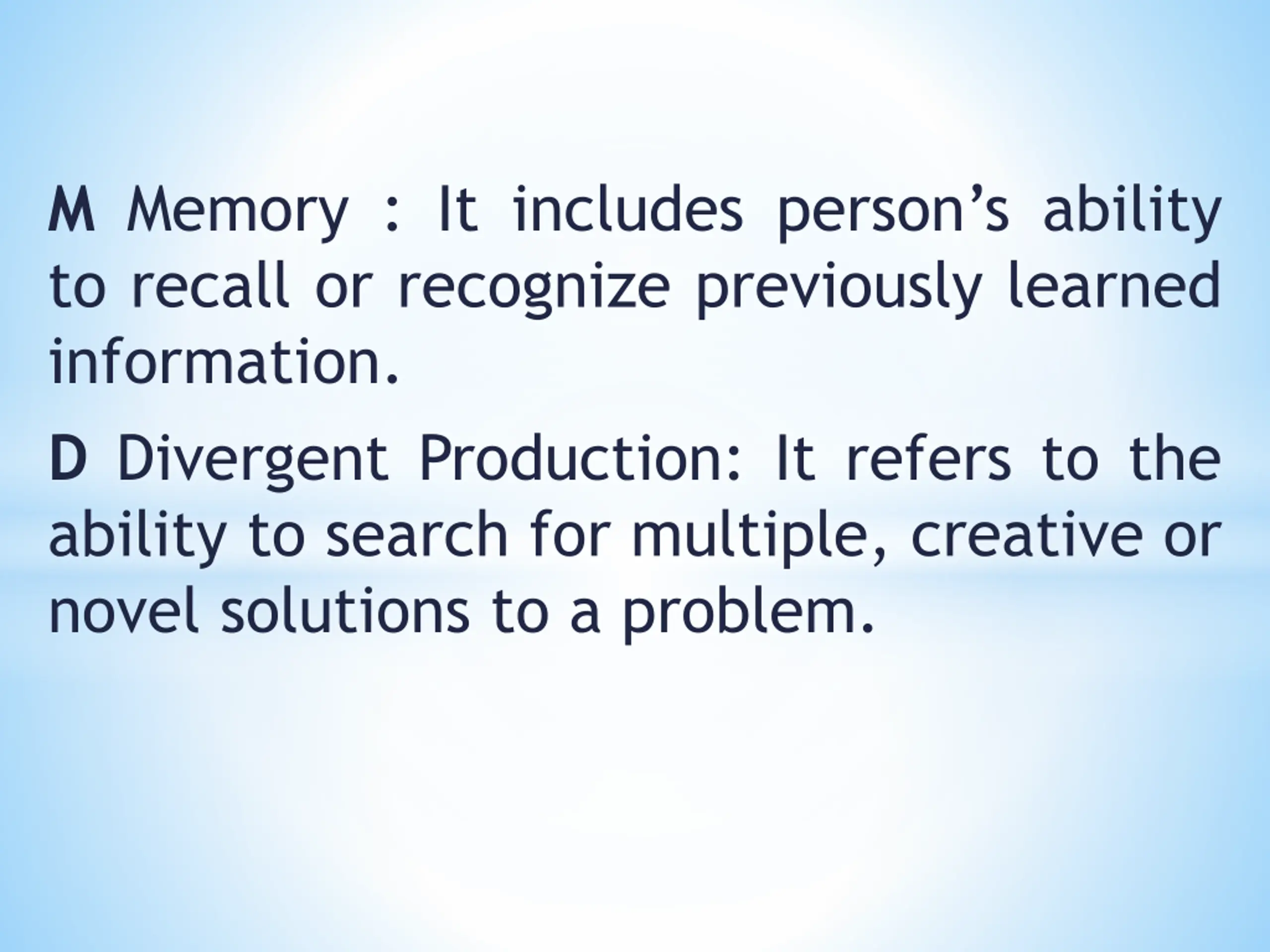 M Memory : It includes persons ability to recall or recognize previously learned information. D Divergent Production: It refers to the ability to search for multiple, creative or novel solutions to a problem.