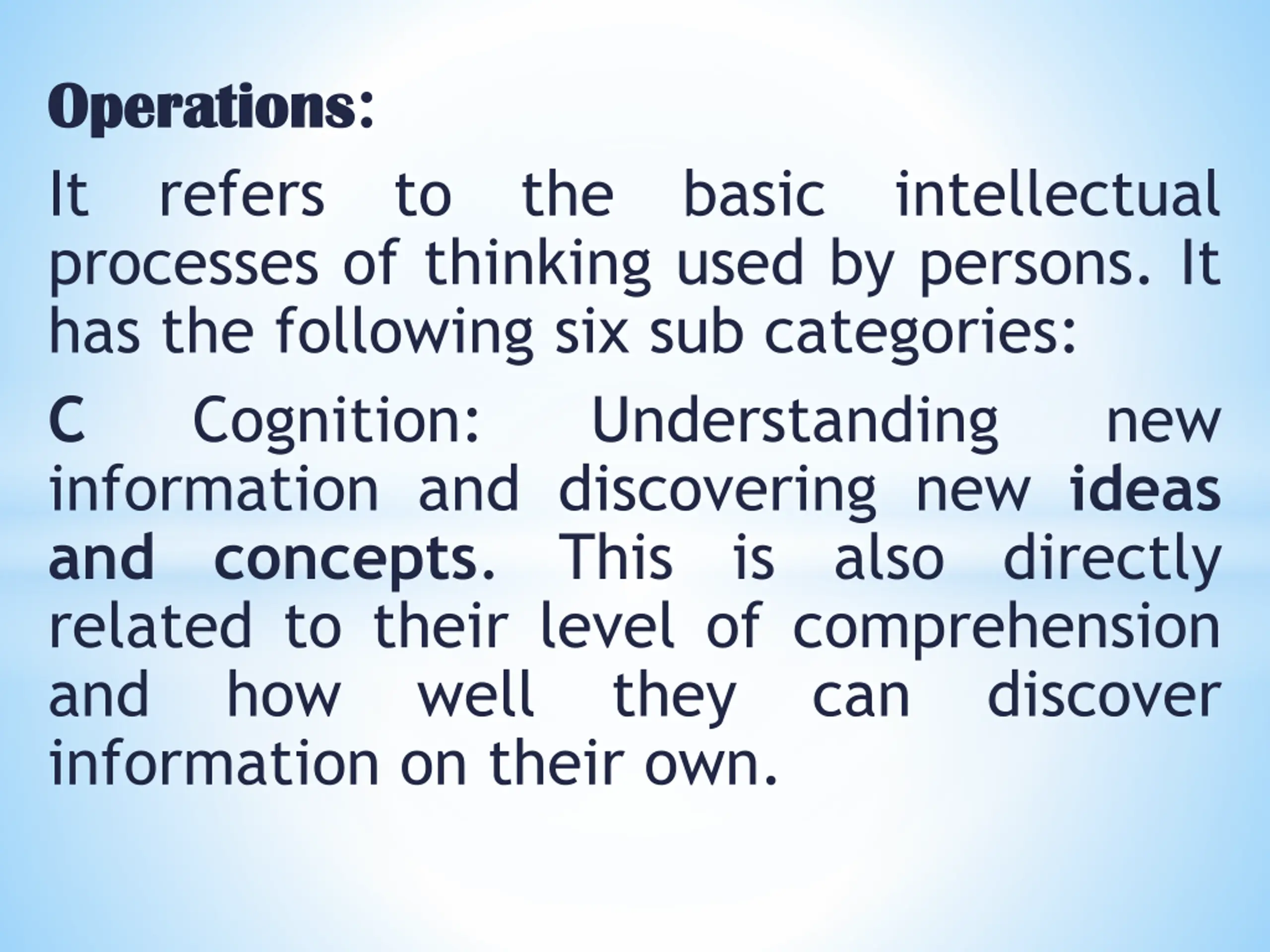 Operations Operations: It refers processes of thinking used by persons. It has the following six sub categories: C Cognition: Understanding information and discovering new ideas and concepts. This related to their level of comprehension and how well they information on their own. to the basic intellectual new is also directly can discover
