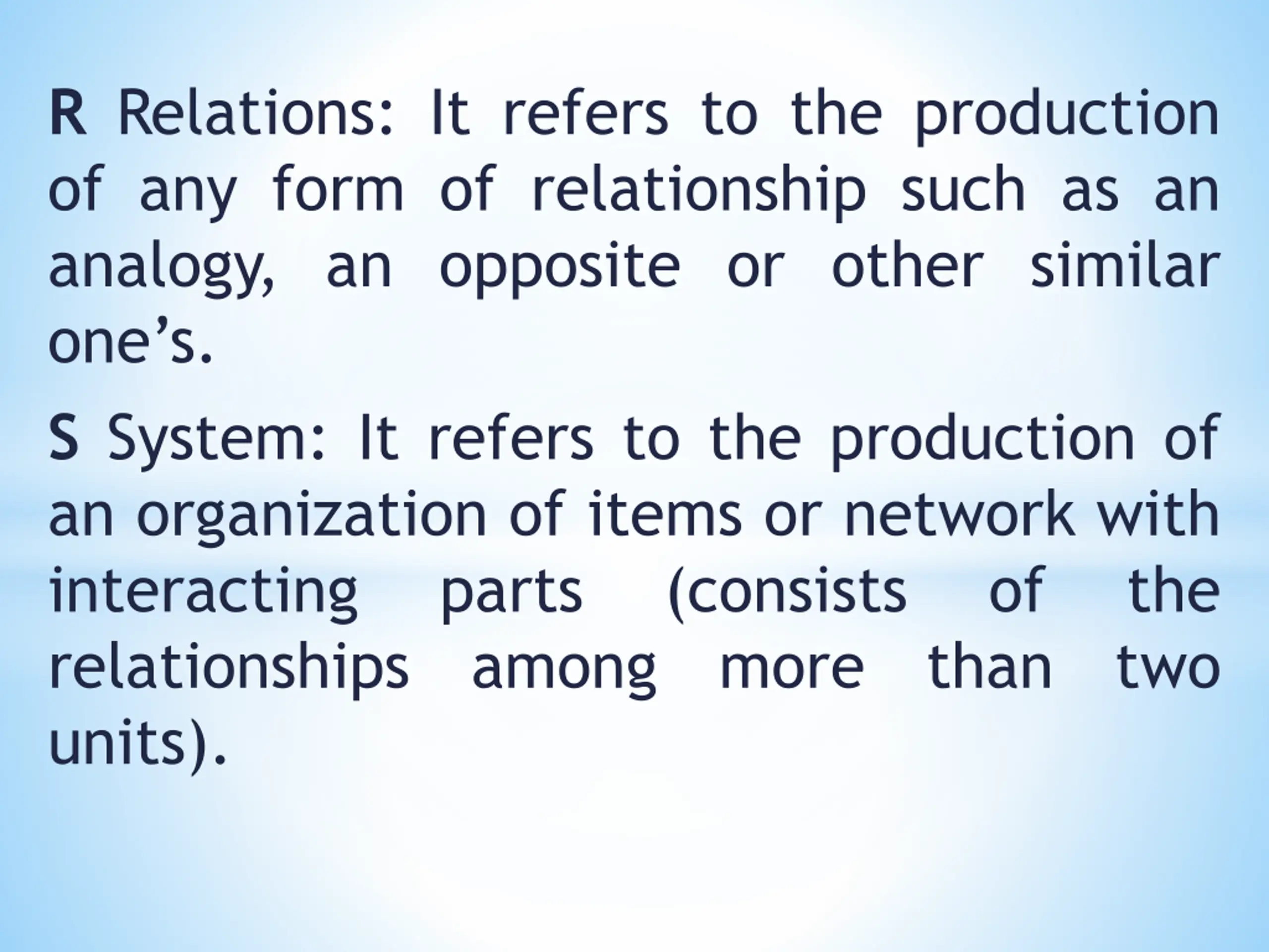 R Relations: It refers to the production of any form of relationship such as an analogy, an opposite or other similar one s. S System: It refers to the production of an organization of items or network with interacting parts relationships among units). (consists more of the two than