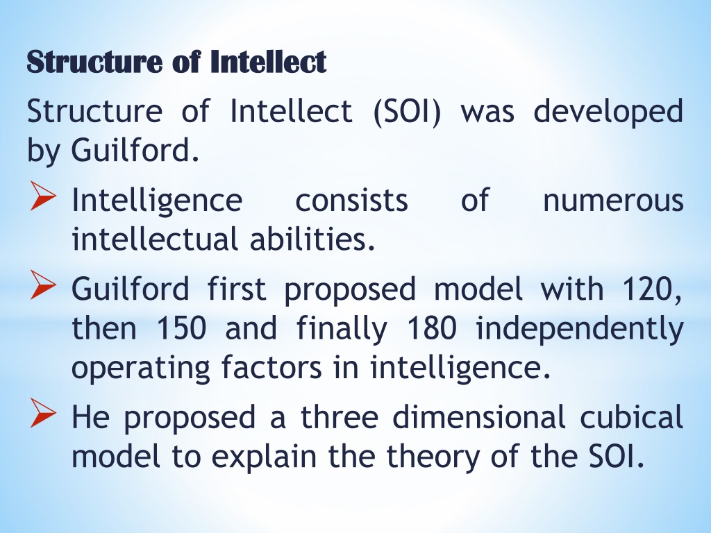 Structure of Intellect Structure of Intellect Structure of Intellect (SOI) was developed by Guilford. Intelligence consists intellectual abilities. Guilford first proposed model with 120, then 150 and finally 180 independently operating factors in intelligence. He proposed a three dimensional cubical model to explain the theory of the SOI. of numerous