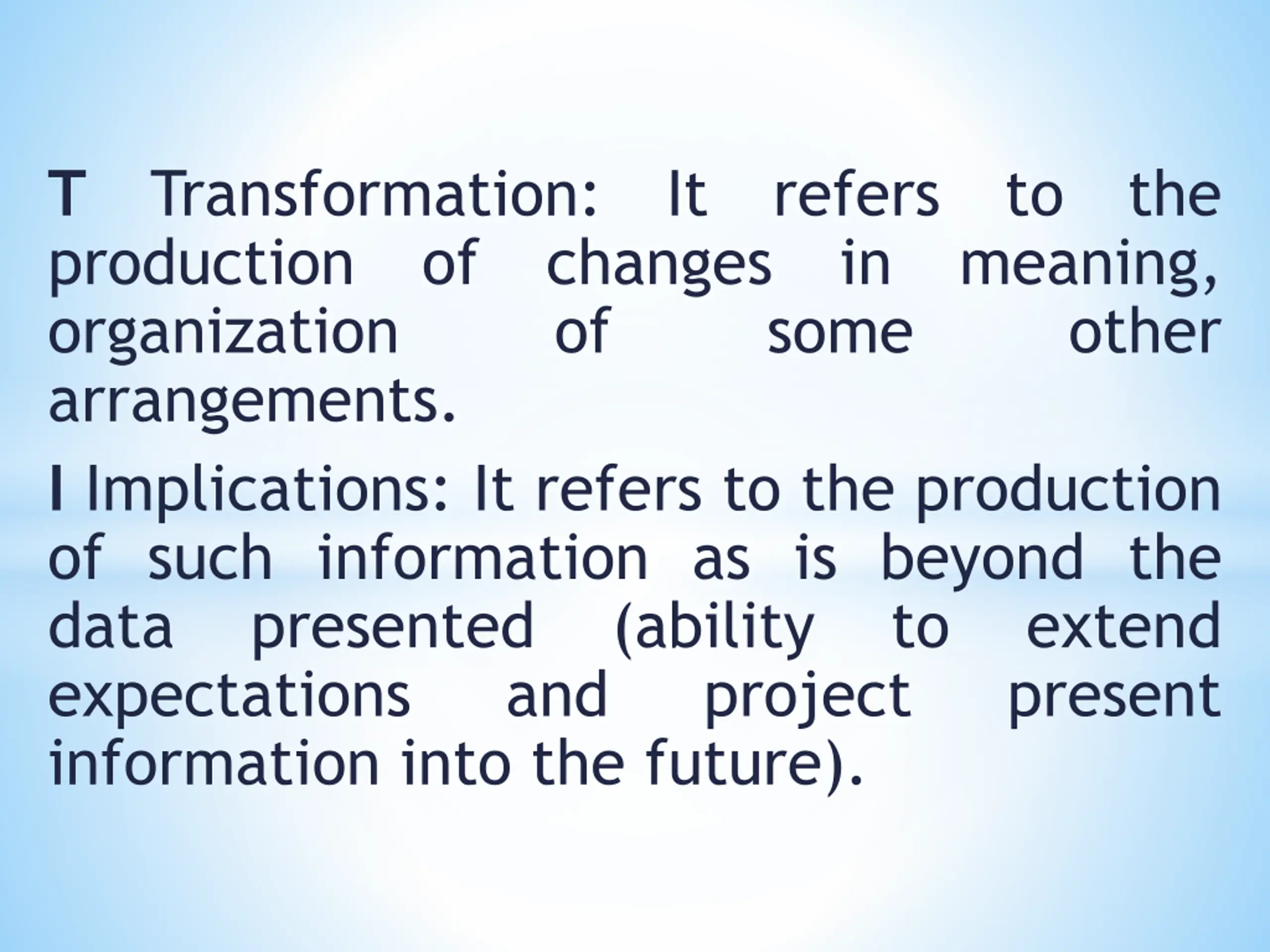 T production organization arrangements. I Implications: It refers to the production of such information as is beyond the data presented (ability expectations and information into the future). Transformation: It refers in some to the of changes of meaning, other to extend present project