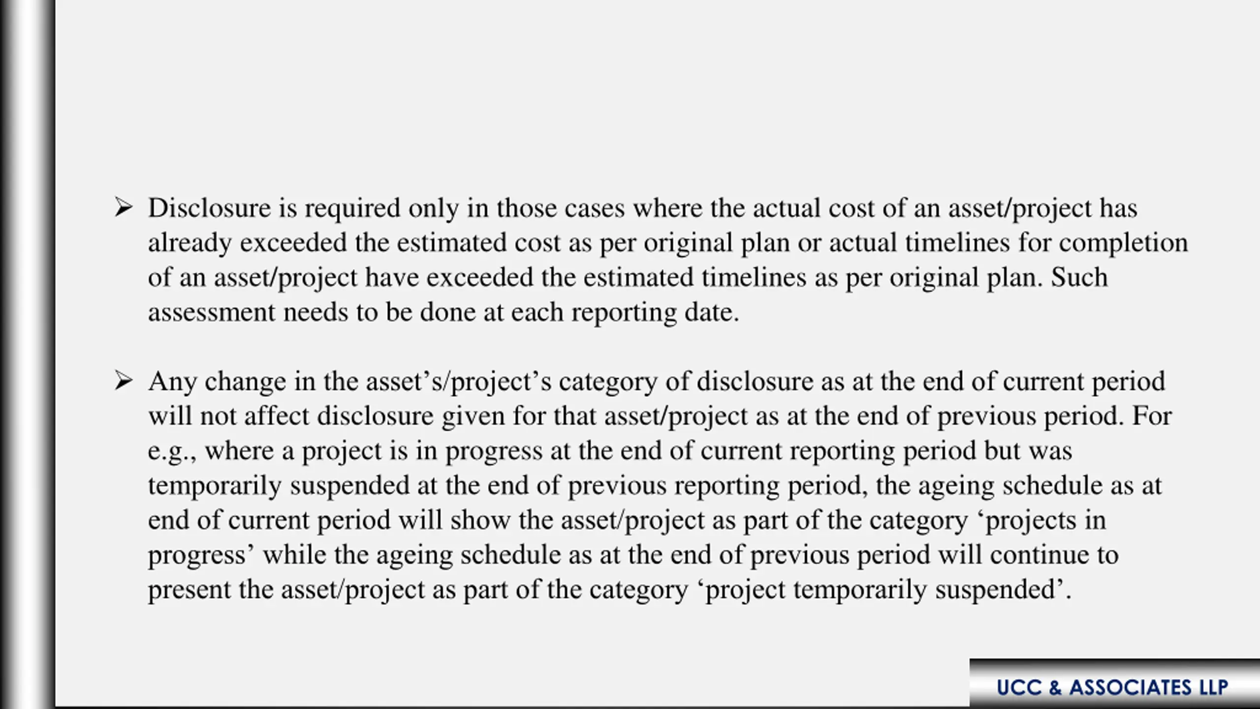 Disclosure is required only in those cases where the actual cost of an asset/project has already exceeded the estimated cost as per original plan or actual timelines for completion of an asset/project have exceeded the estimated timelines as per original plan. Such assessment needs to be done at each reporting date. Any change in the asset s/project s category of disclosure as at the end of current period will not affect disclosure given for that asset/project as at the end of previous period. For e.g., where a project is in progress at the end of current reporting period but was temporarily suspended at the end of previous reporting period, the ageing schedule as at end of current period will show the asset/project as part of the category projects in progress while the ageing schedule as at the end of previous period will continue to present the asset/project as part of the category project temporarily suspended . UCC & ASSOCIATES LLP