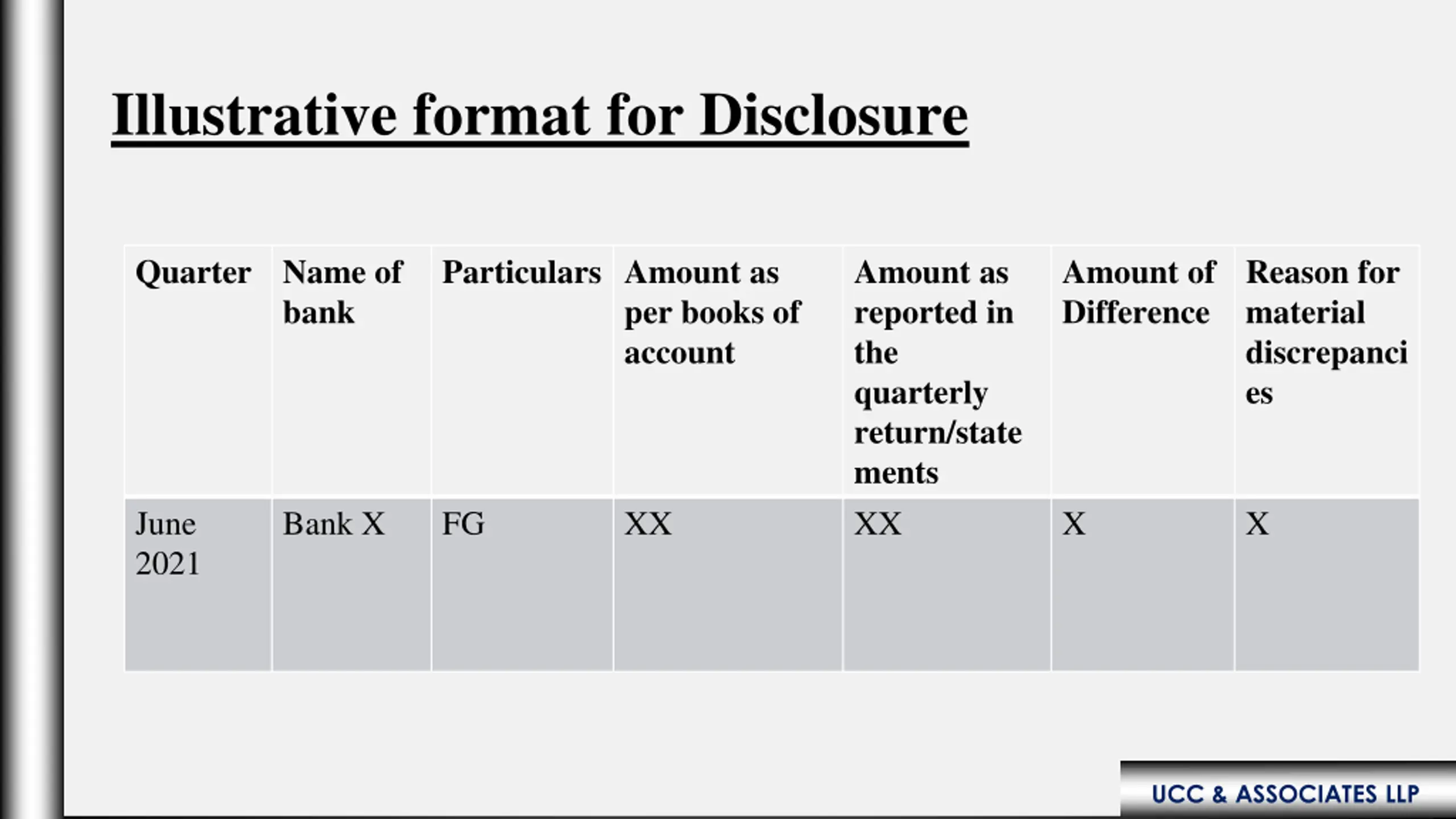 Illustrative format for Disclosure Quarter Name of bank Particulars Amount as Amount as reported in the quarterly return/state ments XX Amount of Difference Reason for material discrepanci es per books of account June 2021 Bank X FG XX X X UCC & ASSOCIATES LLP