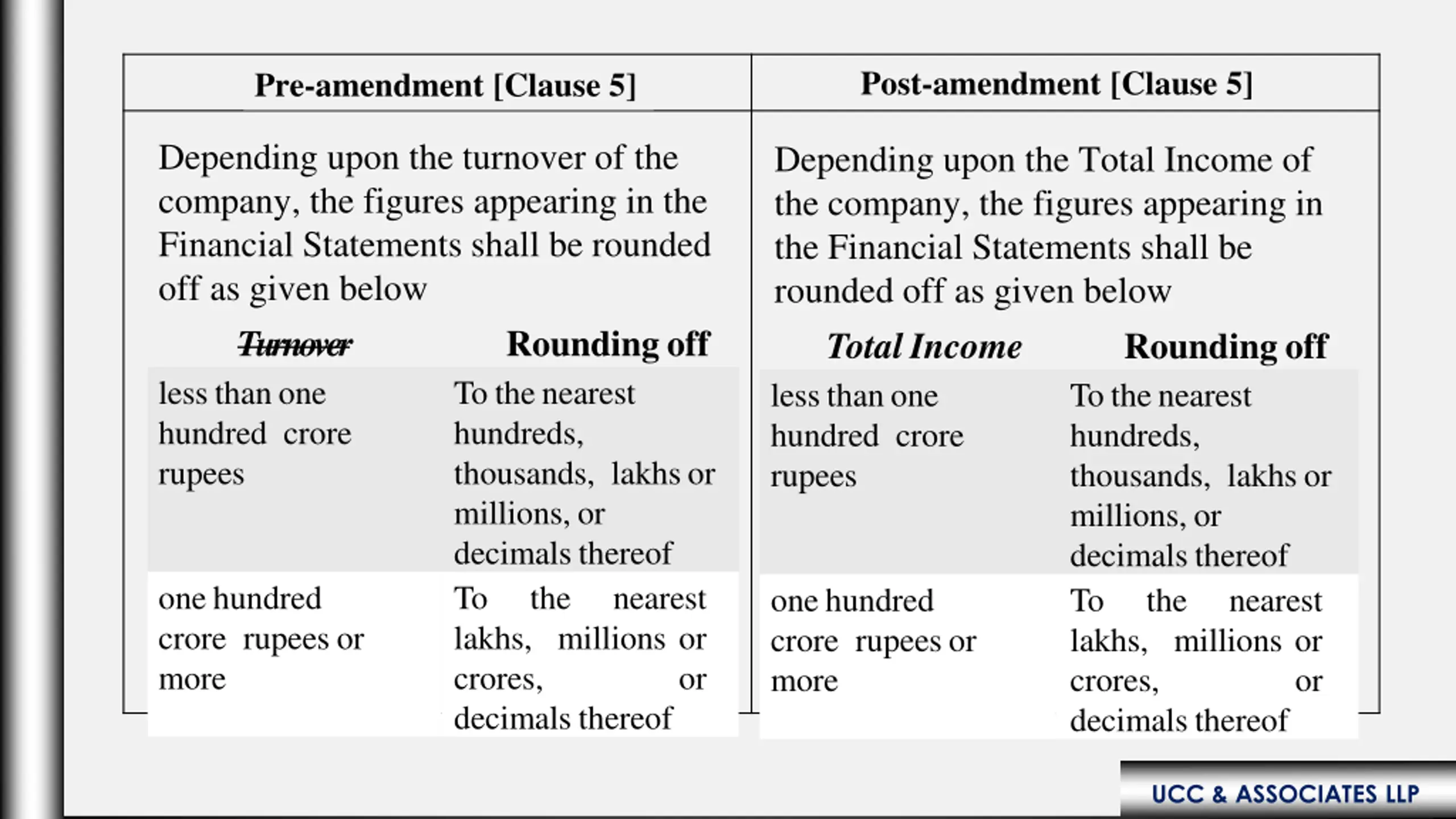 Post-amendment [Clause 5] Pre-amendment [Clause 5] Depending upon the turnover of the company, the figures appearing in the Financial Statements shall be rounded off as given below Turnover less than one hundred crore rupees Depending upon the Total Income of the company, the figures appearing in the Financial Statements shall be rounded off as given below Total Income less than one hundred crore rupees Rounding off To the nearest hundreds, thousands, lakhs or millions, or decimals thereof To the lakhs, millions or crores, decimals thereof Rounding off To the nearest hundreds, thousands, lakhs or millions, or decimals thereof To the lakhs, millions or crores, decimals thereof one hundred crore rupees or more nearest one hundred crore rupees or more nearest or or UCC & ASSOCIATES LLP