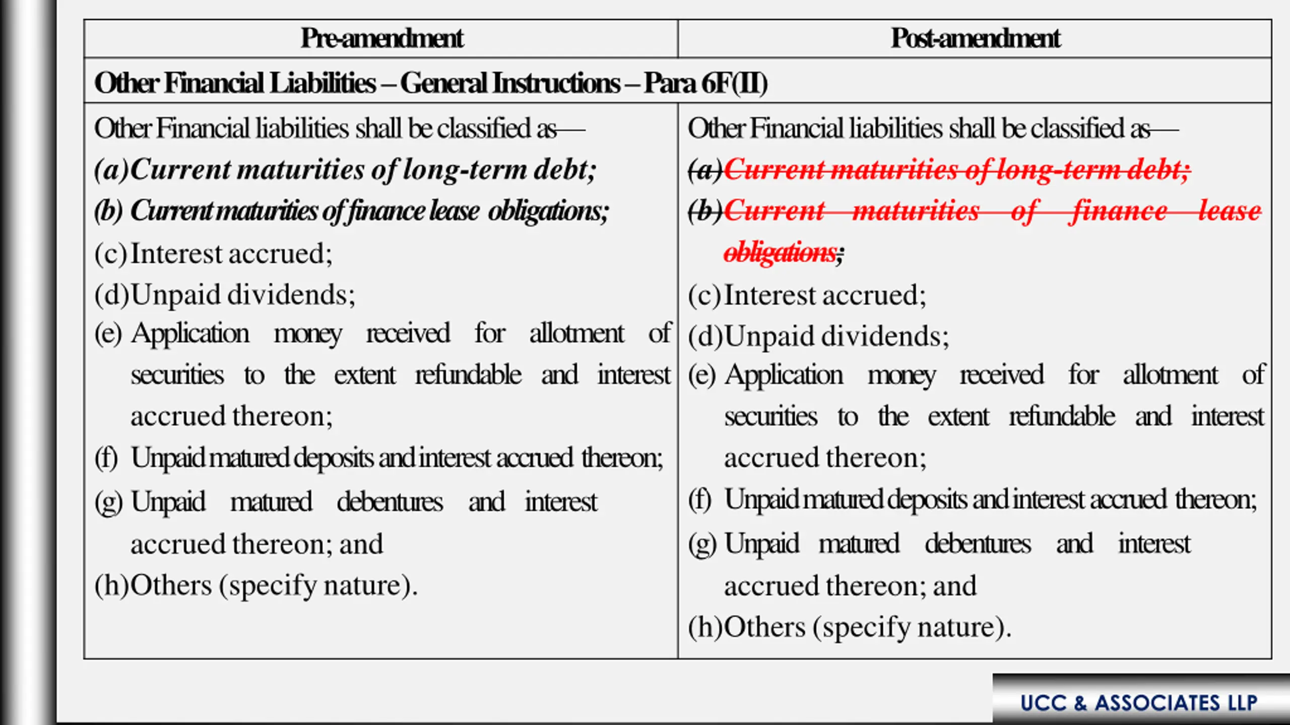 Pre-amendment Post-amendment Other Financial Liabilities General Instructions Para 6F(II) Other Financial liabilities shall be classified as (a)Current maturities of long-term debt; (b)Current maturities of finance lease obligations; (c)Interest accrued; (d)Unpaid dividends; (e) Application money received for allotment of securities to the extent refundable and interest accrued thereon; (f) Unpaid matured deposits and interest accrued thereon; (g)Unpaid matured debentures and interest accrued thereon; and (h)Others (specify nature). Other Financial liabilities shall be classified as (a)Current maturities of long-term debt; (b)Current maturities of finance lease obligations; (c)Interest accrued; (d)Unpaid dividends; (e) Application money received for allotment of securities to the extent refundable and interest accrued thereon; (f) Unpaid matured deposits and interest accrued thereon; (g)Unpaid matured debentures and interest accrued thereon; and (h)Others (specify nature). UCC & ASSOCIATES LLP