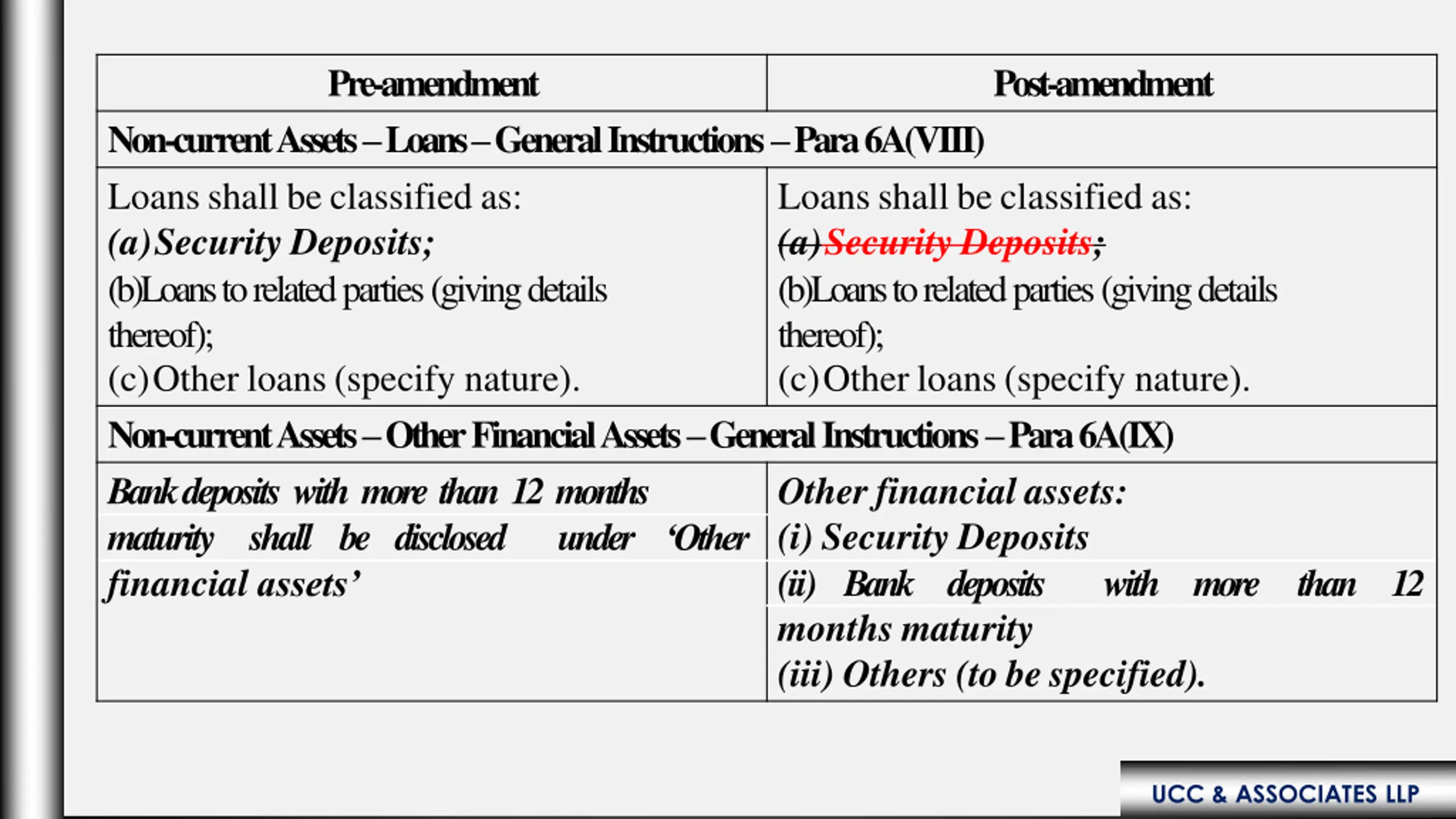 Pre-amendment Post-amendment Non-current Assets Loans General Instructions Para 6A(VIII) Loans shall be classified as: (a)Security Deposits; (b)Loans to related parties (giving details thereof); (c)Other loans (specify nature). Non-current Assets Other Financial Assets General Instructions Para 6A(IX) Bank deposits with more than 12 months maturity shall be disclosed under Other financial assets Loans shall be classified as: (a)Security Deposits; (b)Loans to related parties (giving details thereof); (c)Other loans (specify nature). Other financial assets: (i) Security Deposits (ii) Bank deposits months maturity (iii) Others (to be specified). with more than 12 UCC & ASSOCIATES LLP
