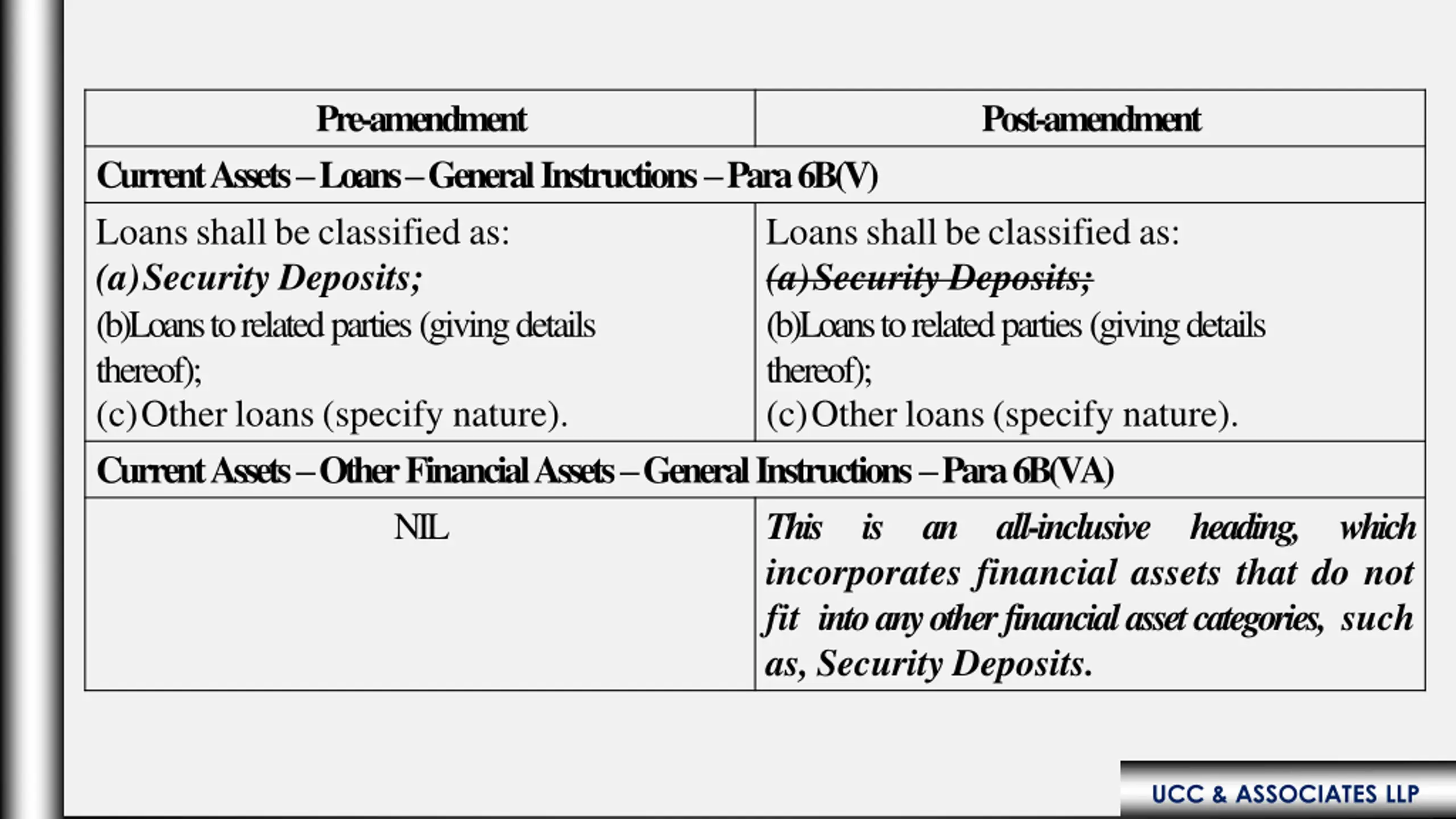 Pre-amendment Post-amendment Current Assets Loans General Instructions Para 6B(V) Loans shall be classified as: (a)Security Deposits; (b)Loans to related parties (giving details thereof); (c)Other loans (specify nature). Current Assets Other Financial Assets General Instructions Para 6B(VA) NIL Loans shall be classified as: (a)Security Deposits; (b)Loans to related parties (giving details thereof); (c)Other loans (specify nature). This is an all-inclusive heading, which incorporates financial assets that do not fit into any other financial asset categories, such as, Security Deposits. UCC & ASSOCIATES LLP