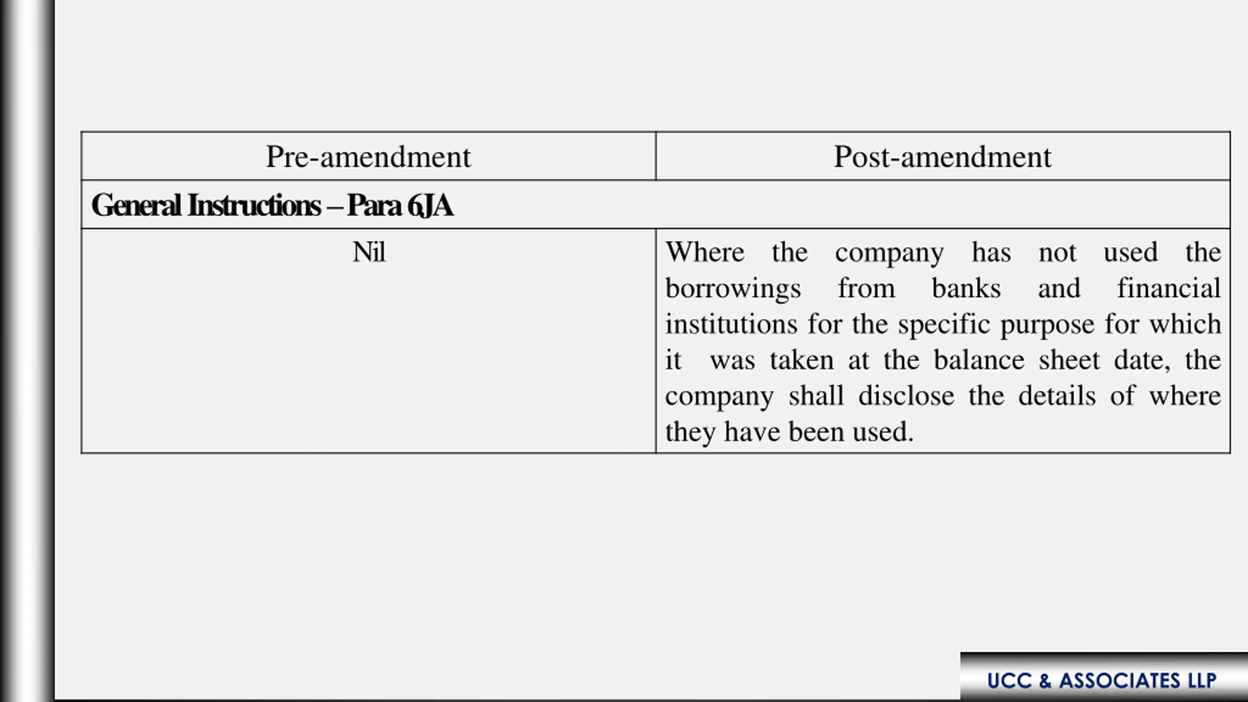 Pre-amendment Post-amendment General Instructions Para 6JA Nil Where the company has not used the borrowings from banks institutions for the specific purpose for which it was taken at the balance sheet date, the company shall disclose the details of where they have been used. and financial UCC & ASSOCIATES LLP
