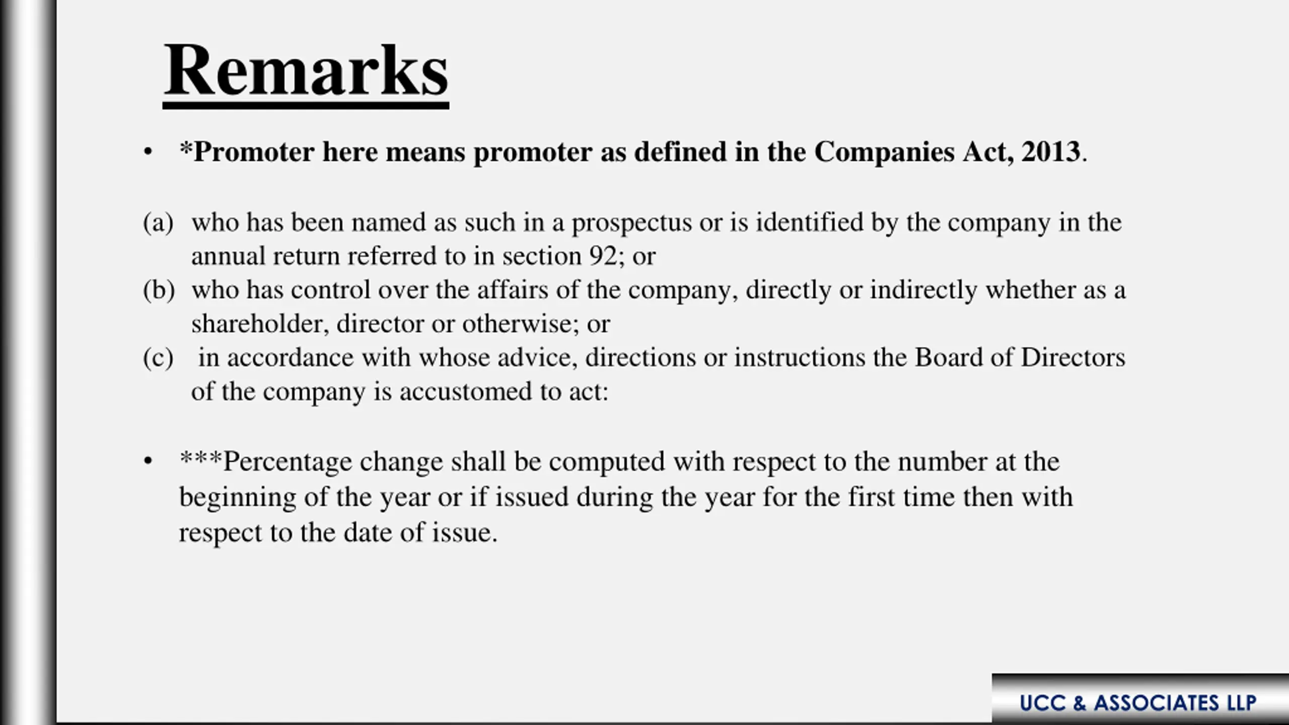 Remarks *Promoter here means promoter as defined in the Companies Act, 2013. (a) who has been named as such in a prospectus or is identified by the company in the annual return referred to in section 92; or (b) who has control over the affairs of the company, directly or indirectly whether as a shareholder, director or otherwise; or (c) in accordance with whose advice, directions or instructions the Board of Directors of the company is accustomed to act: ***Percentage change shall be computed with respect to the number at the beginning of the year or if issued during the year for the first time then with respect to the date of issue. UCC & ASSOCIATES LLP