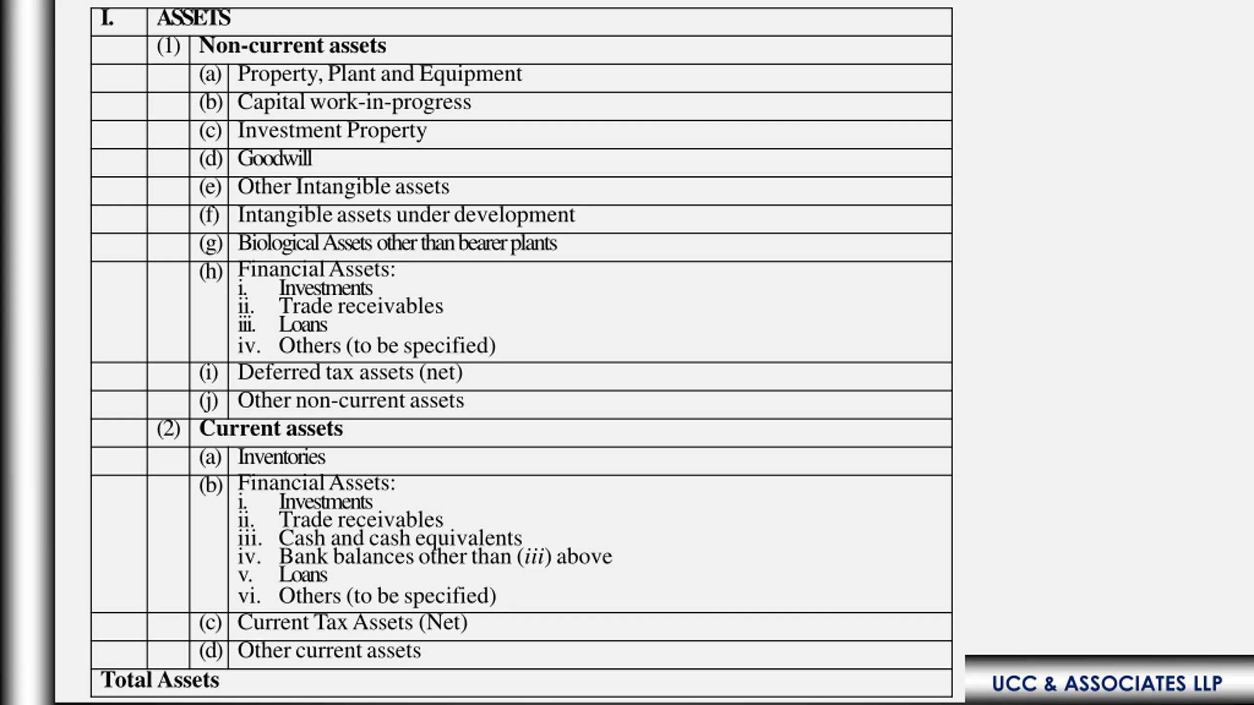 I. ASSETS (1) Non-current assets (a) Property, Plant and Equipment (b) Capital work-in-progress (c) Investment Property (d) Goodwill (e) Other Intangible assets (f) Intangible assets under development (g) Biological Assets other than bearer plants (h) Financial Assets: i. Investments ii. Trade receivables iii. Loans iv. Others (to be specified) (i) Deferred tax assets (net) (j) Other non-current assets (2) Current assets (a) Inventories (b) Financial Assets: i. Investments ii. Trade receivables iii. Cash and cash equivalents iv. Bank balances other than (iii) above v. Loans vi. Others (to be specified) (c) Current Tax Assets (Net) (d) Other current assets Total Assets UCC & ASSOCIATES LLP