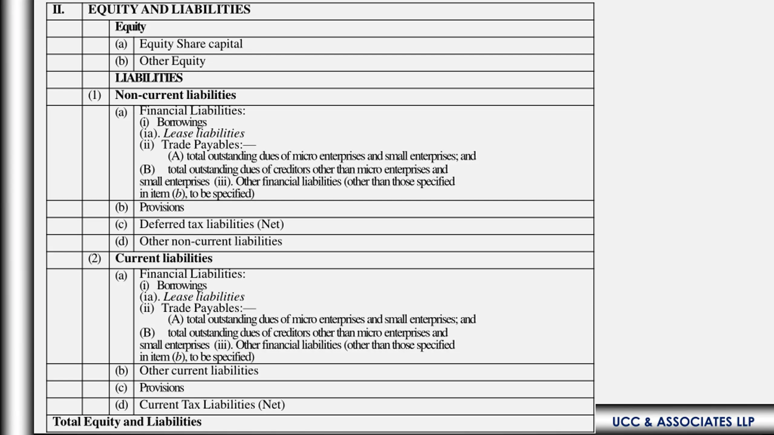 Post-amendment Post LIABILITIES (2) Current liabilities (a) Financial Liabilities (i) Borrowings (ia) Lease liabilities (ii)Trade payables: A. total outstanding dues of micro enterprises and small enterprises; and B. total outstanding dues of creditors other than micro enterprises and small enterprises (iii)Other financial liabilities (other than those specified in item (b), to be specified) (b) Other current liabilities (c) Provisions (d) Current tax liabilities (Net) Pre-amendment Post LIABILITIES (2) Current liabilities (a) Financial Liabilities (i) Borrowings (ii)Trade payables: A. total outstanding dues of micro enterprises and small enterprises; and B. total outstanding dues of creditors other than micro enterprises and small enterprises (iii)Other financial liabilities (other than those specified in item (b), to be specified) (b) Other current liabilities (c) Provisions (d) Current tax liabilities (Net) UCC & ASSOCIATES LLP
