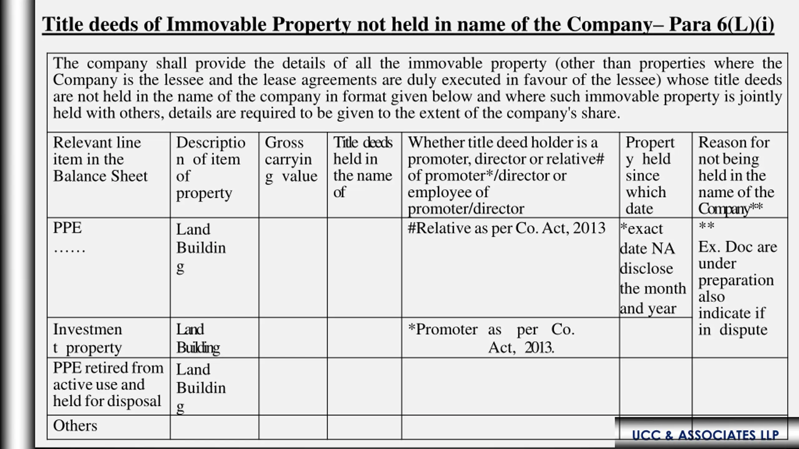 Remarks The Act does not define title deeds . In general, title deeds mean a legal deed or document constituting evidence of a right (eg. registered sale deed, transfer deed, conveyance deed of land), especially to the legal ownership of the immovable property In case of leased assets, title deeds would imply the lease agreements and related documents. Where the Company is the lessee of an immovable property and the lease agreements are not duly executed in favour of the lessee then appropriate disclosure has to be provided for such immovable properties. UCC & ASSOCIATES LLP