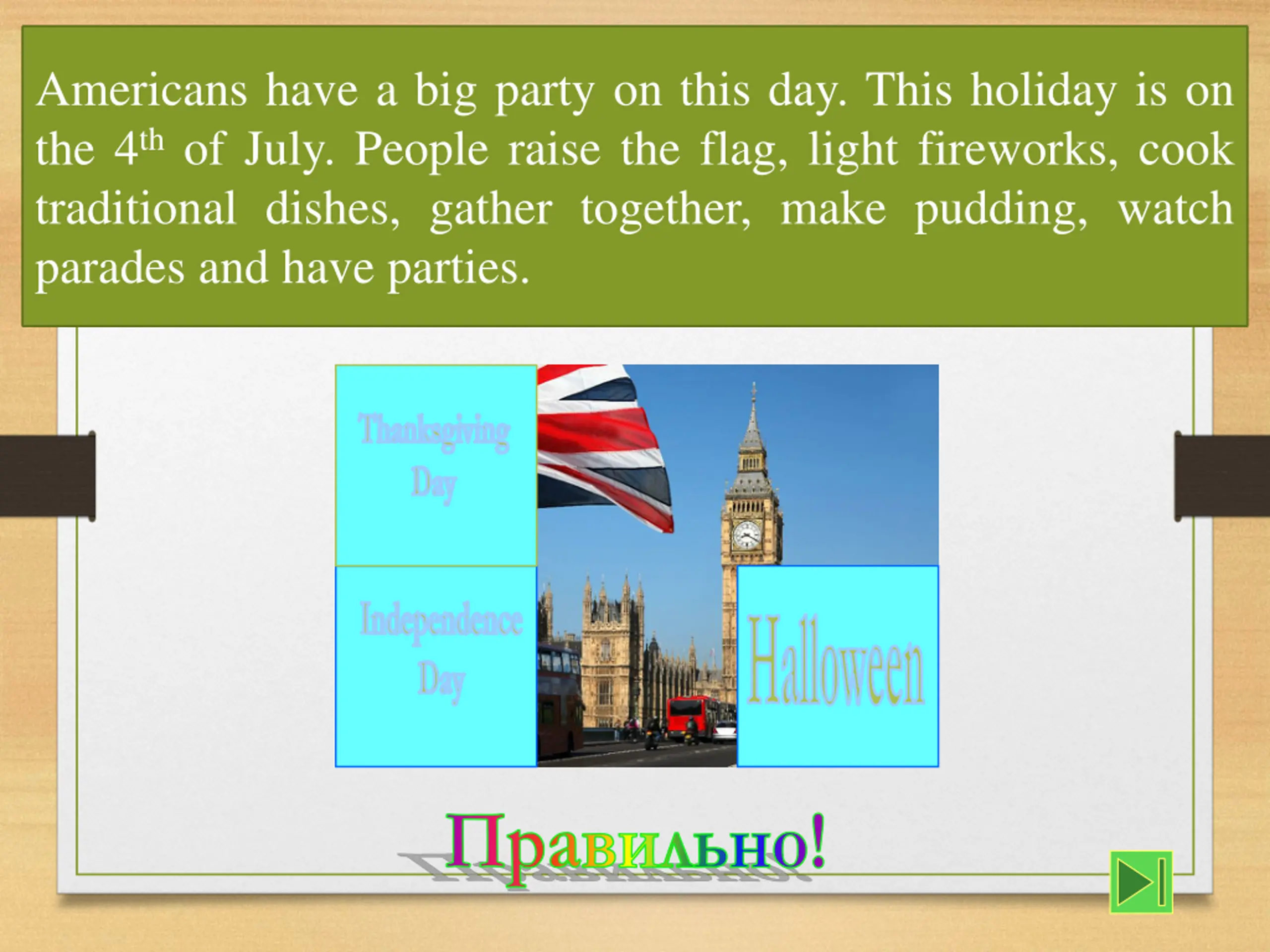 Americans have a big party on this day. This holiday is on the 4thof July. People raise the flag, light fireworks, cook traditional dishes, gather together, make pudding, watch parades and have parties. Thanksgiving Independence Day Halloween !