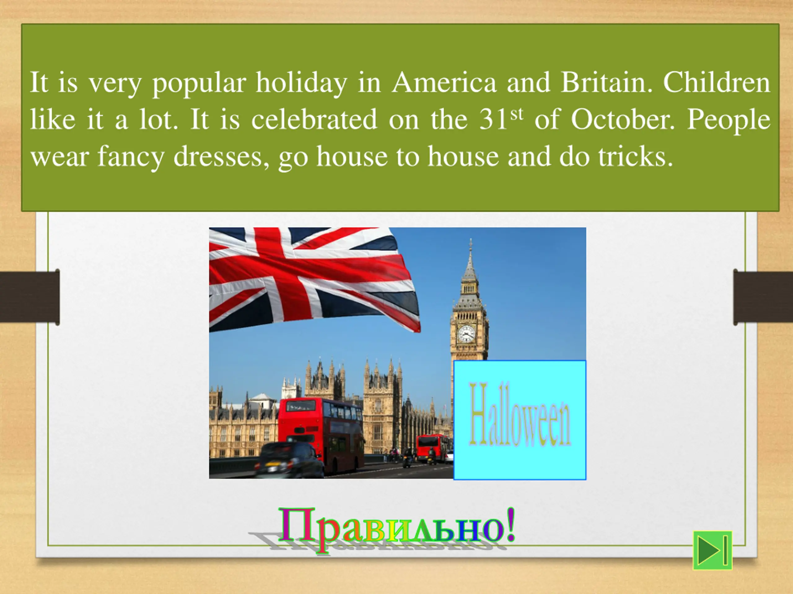 It is very popular holiday in America and Britain. Children like it a lot. It is celebrated on the 31stof October. People wear fancy dresses, go house to house and do tricks. Halloween !