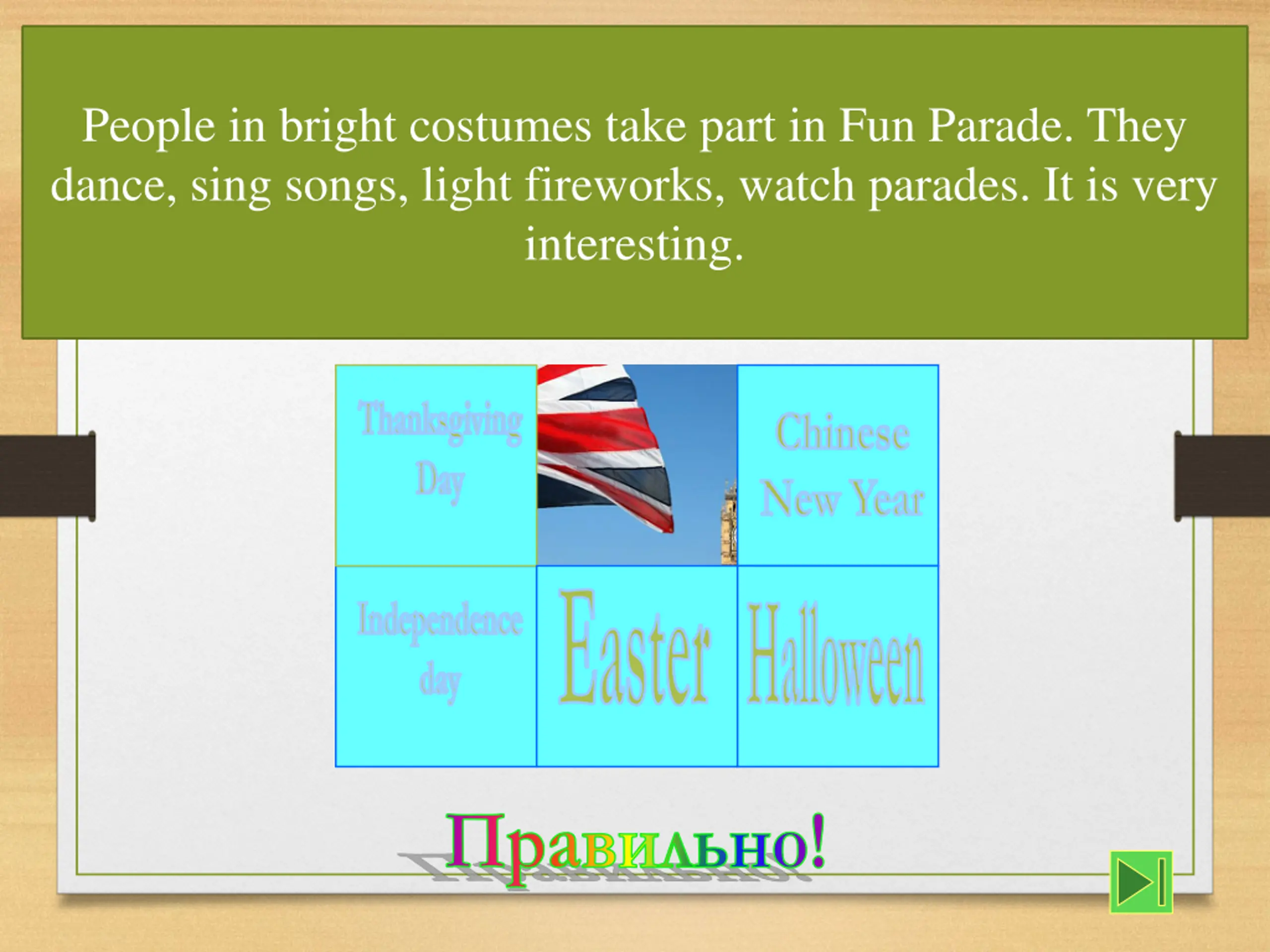 People in bright costumes take part in Fun Parade. They dance, sing songs, light fireworks, watch parades. It is very interesting. Thanksgiving Day Chinese New Year Easter Independence day Halloween !