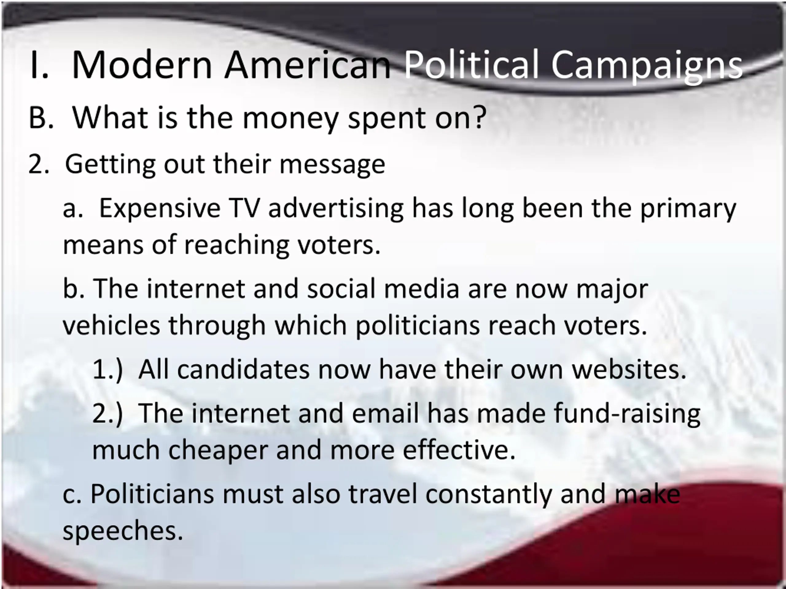 I. Modern American Political Campaigns B. What is the money spent on? 2. Getting out their message a. Expensive TV advertising has long been the primary means of reaching voters. b. The internet and social media are now major vehicles through which politicians reach voters. 1.) All candidates now have their own websites. 2.) The internet and email has made fund-raising much cheaper and more effective. c. Politicians must also travel constantly and make speeches.