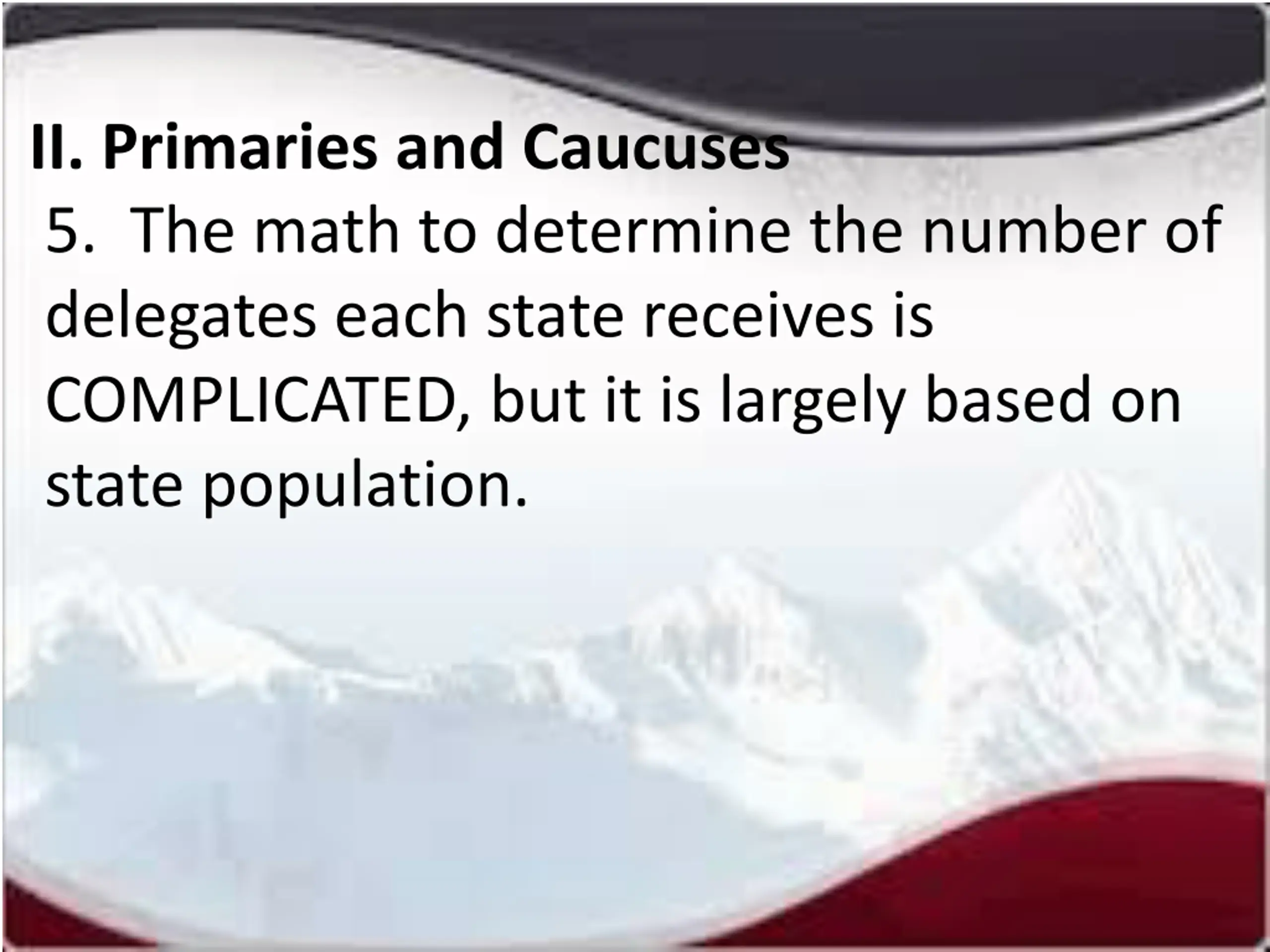II. Primaries and Caucuses 5. The math to determine the number of delegates each state receives is COMPLICATED, but it is largely based on state population.