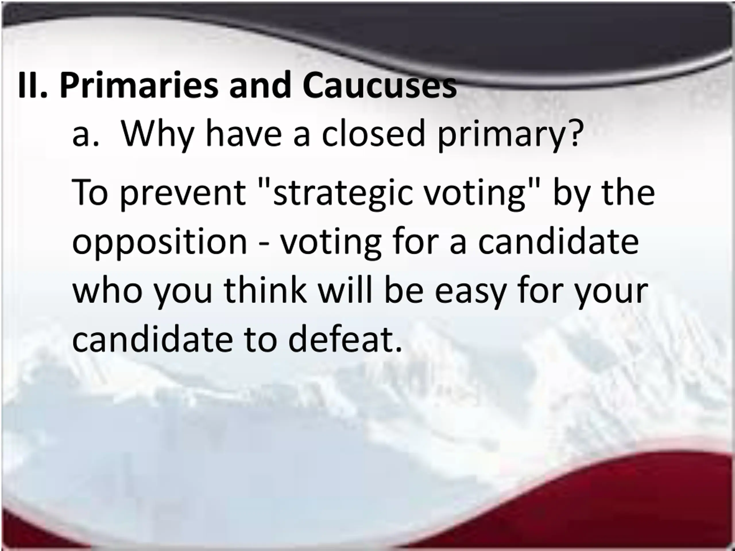 II. Primaries and Caucuses a. Why have a closed primary? To prevent "strategic voting" by the opposition - voting for a candidate who you think will be easy for your candidate to defeat.