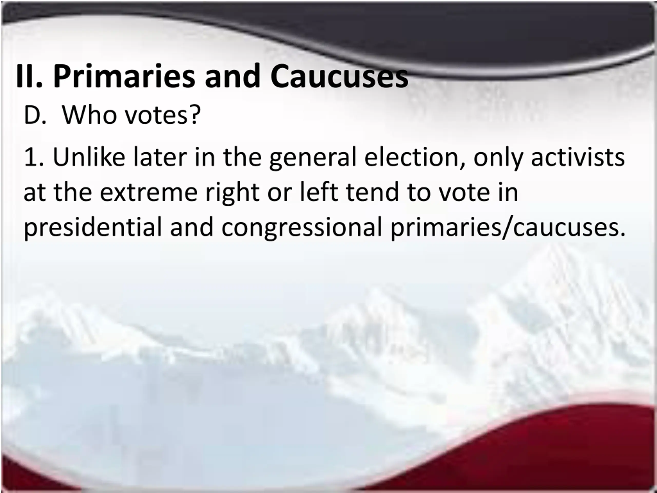 II. Primaries and Caucuses D. Who votes? 1. Unlike later in the general election, only activists at the extreme right or left tend to vote in presidential and congressional primaries/caucuses.