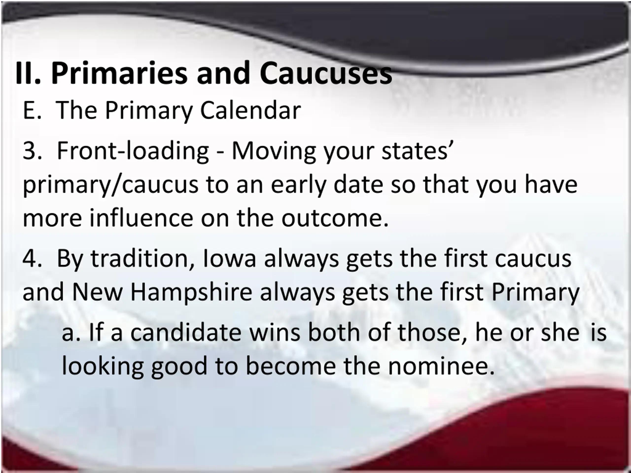 II. Primaries and Caucuses E. The Primary Calendar 3. Front-loading - Moving your states primary/caucus to an early date so that you have more influence on the outcome. 4. By tradition, Iowa always gets the first caucus and New Hampshire always gets the first Primary a. If a candidate wins both of those, he or she is looking good to become the nominee.