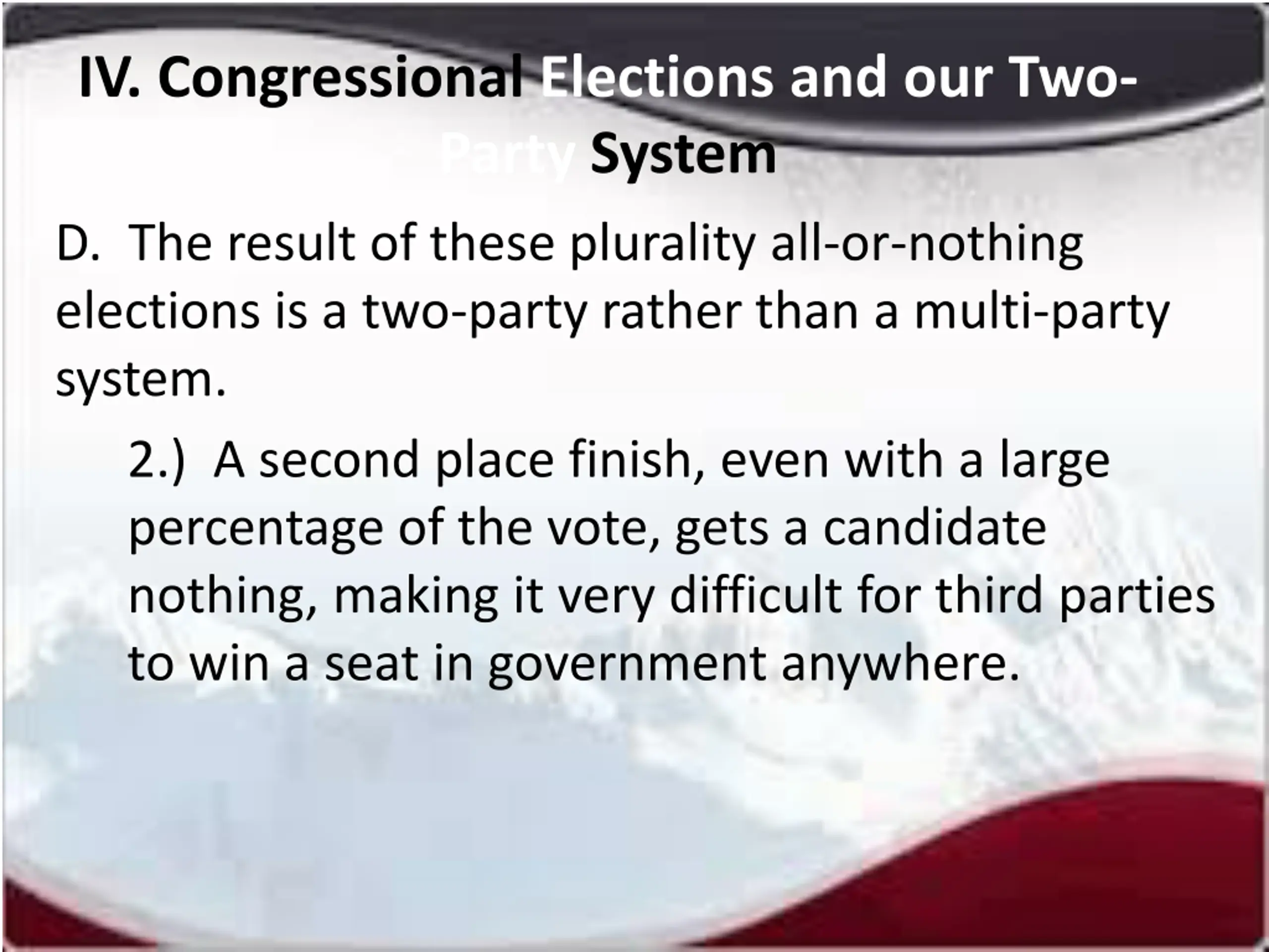 IV. Congressional Elections and our Two- Party System D. The result of these plurality all-or-nothing elections is a two-party rather than a multi-party system. 2.) A second place finish, even with a large percentage of the vote, gets a candidate nothing, making it very difficult for third parties to win a seat in government anywhere.