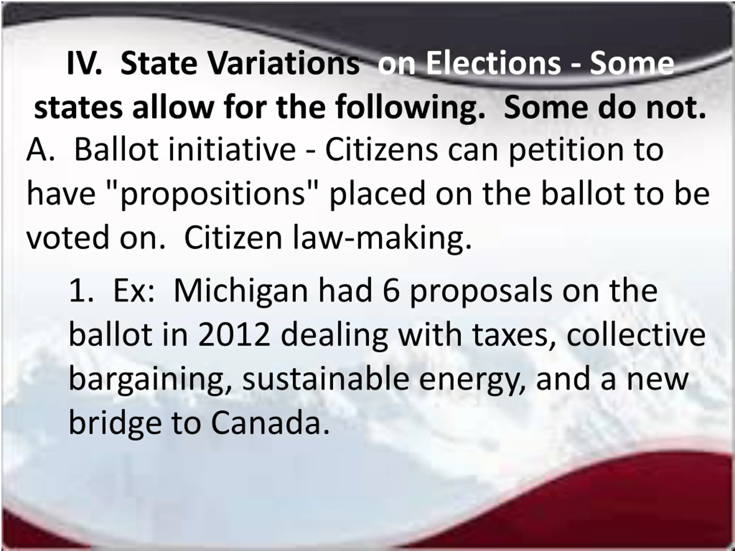 IV. State Variations on Elections - Some states allow for the following. Some do not. A. Ballot initiative - Citizens can petition to have "propositions" placed on the ballot to be voted on. Citizen law-making. 1. Ex: Michigan had 6 proposals on the ballot in 2012 dealing with taxes, collective bargaining, sustainable energy, and a new bridge to Canada.