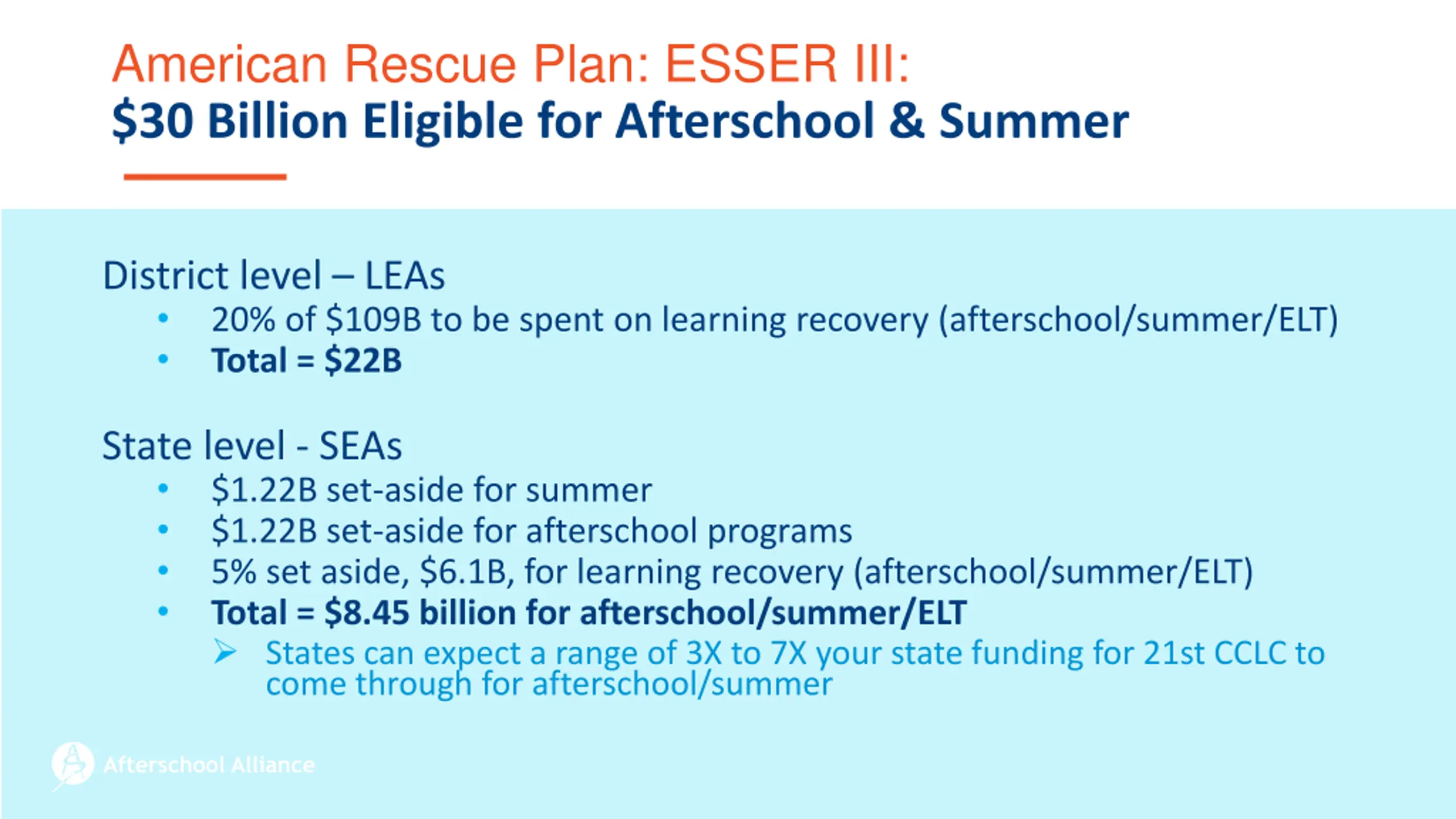 American Rescue Plan: ESSER III: $30 Billion Eligible for Afterschool & Summer District level LEAs 20% of $109B to be spent on learning recovery (afterschool/summer/ELT) Total = $22B State level - SEAs $1.22B set-aside for summer $1.22B set-aside for afterschool programs 5% set aside, $6.1B, for learning recovery (afterschool/summer/ELT) Total = $8.45 billion for afterschool/summer/ELT States can expect a range of 3X to 7X your state funding for 21st CCLC to come through for afterschool/summer
