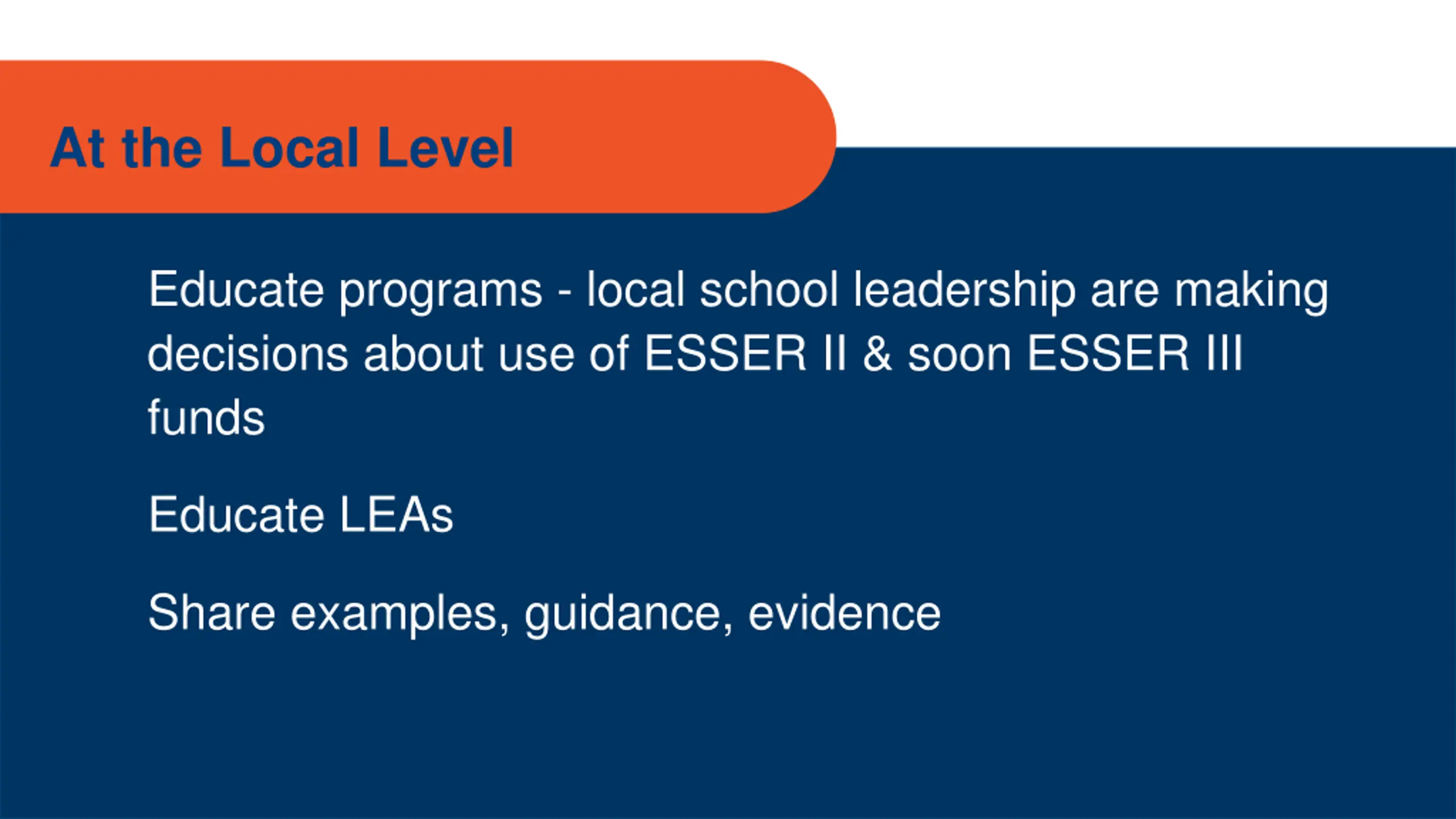 At the Local Level Educate programs - local school leadership are making decisions about use of ESSER II & soon ESSER III funds Educate LEAs Share examples, guidance, evidence