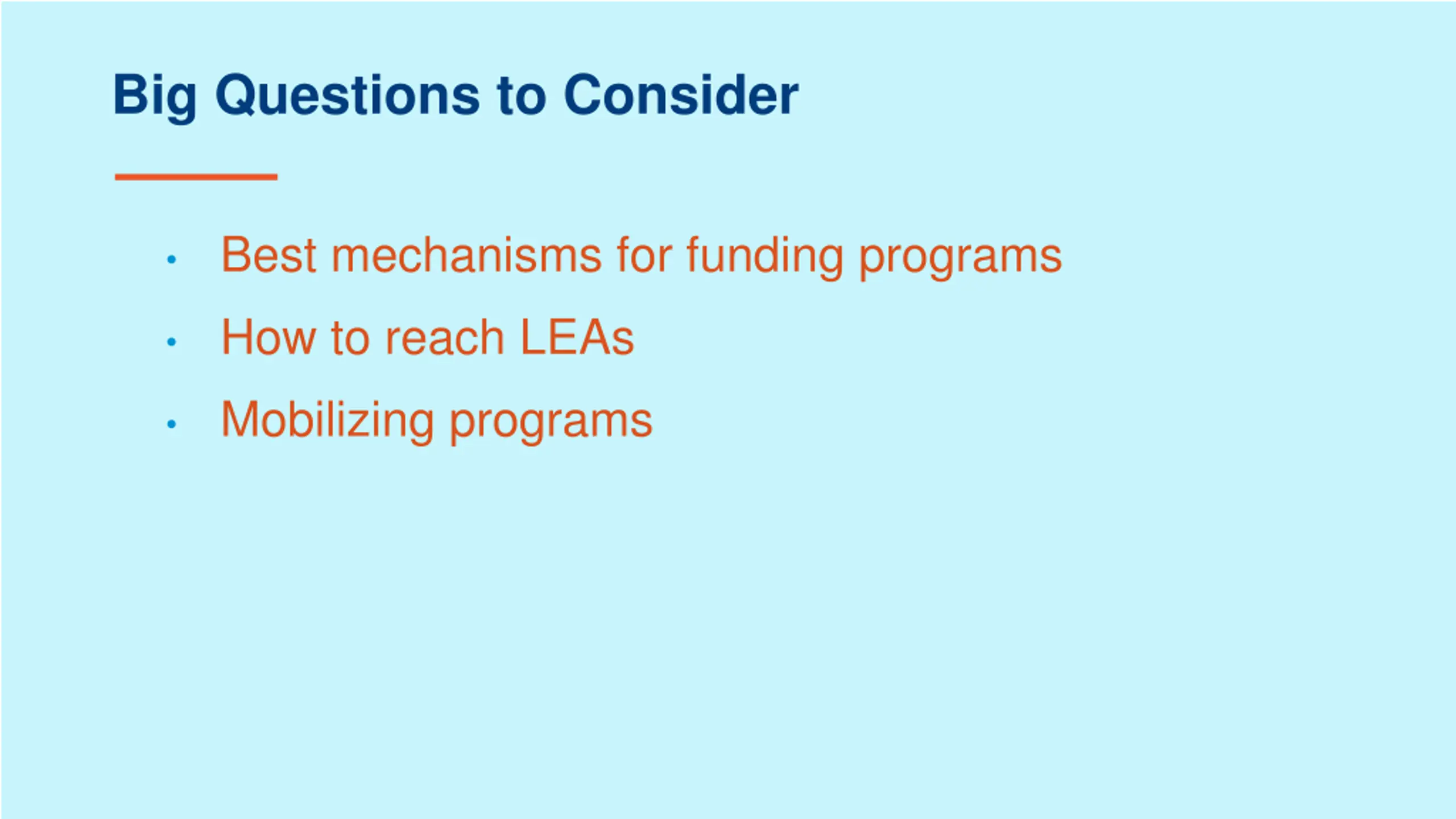 Big Questions to Consider Best mechanisms for funding programs How to reach LEAs Mobilizing programs