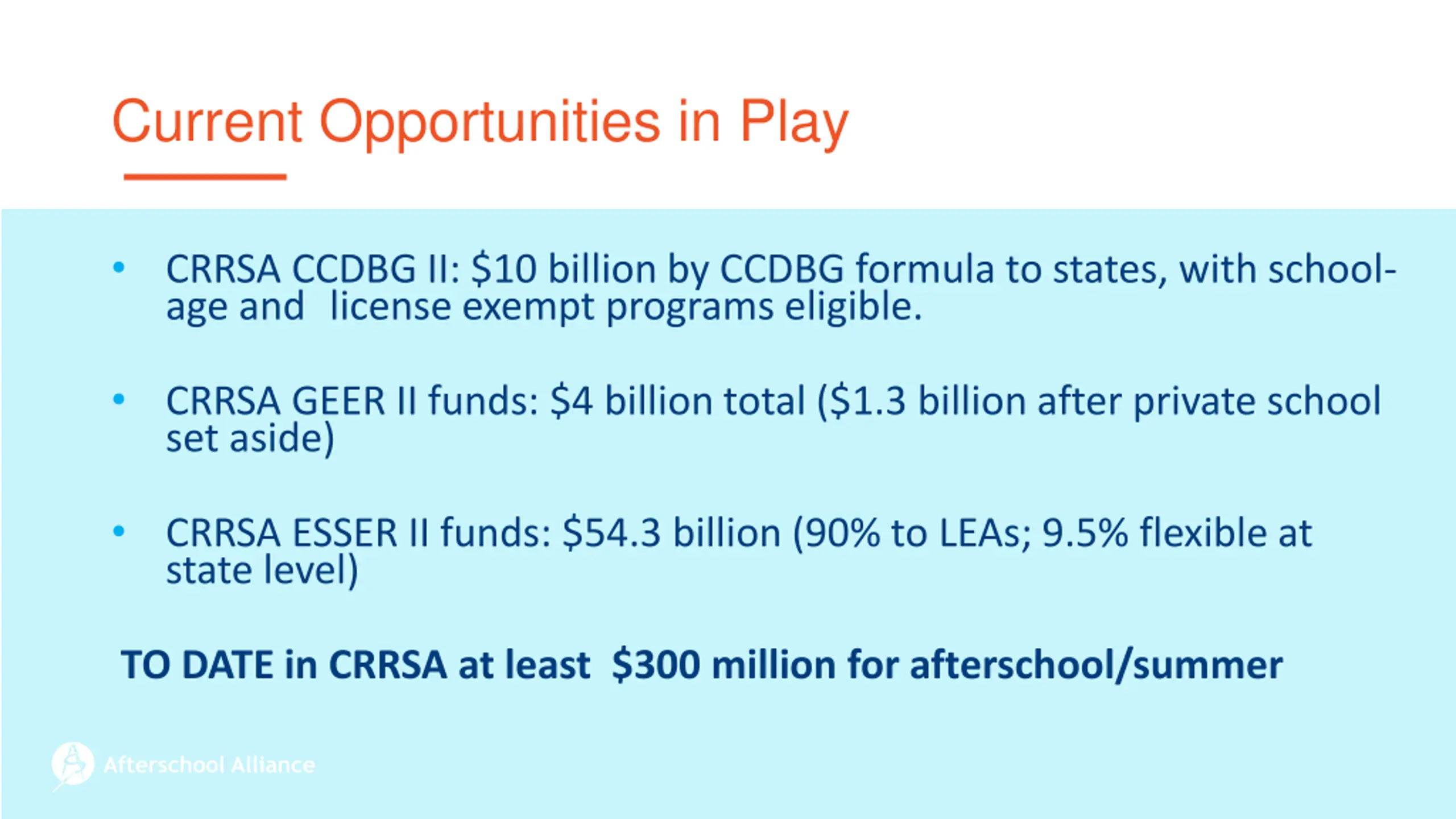 Current Opportunities in Play CRRSA CCDBG II: $10 billion by CCDBG formula to states, with school- age and license exempt programs eligible. CRRSA GEER II funds: $4 billion total ($1.3 billion after private school set aside) CRRSA ESSER II funds: $54.3 billion (90% to LEAs; 9.5% flexible at state level) TO DATE in CRRSA at least $300 million for afterschool/summer