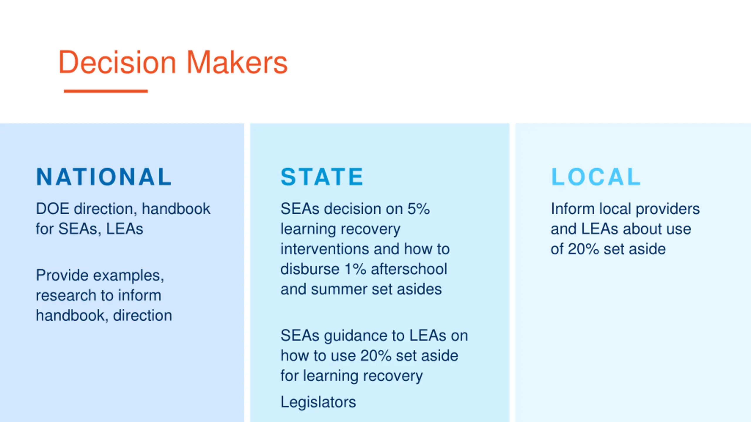 Decision Makers NATIONAL STATE LOCAL DOE direction, handbook for SEAs, LEAs SEAs decision on 5% learning recovery interventions and how to disburse 1% afterschool and summer set asides Inform local providers and LEAs about use of 20% set aside Provide examples, research to inform handbook, direction SEAs guidance to LEAs on how to use 20% set aside for learning recovery Legislators