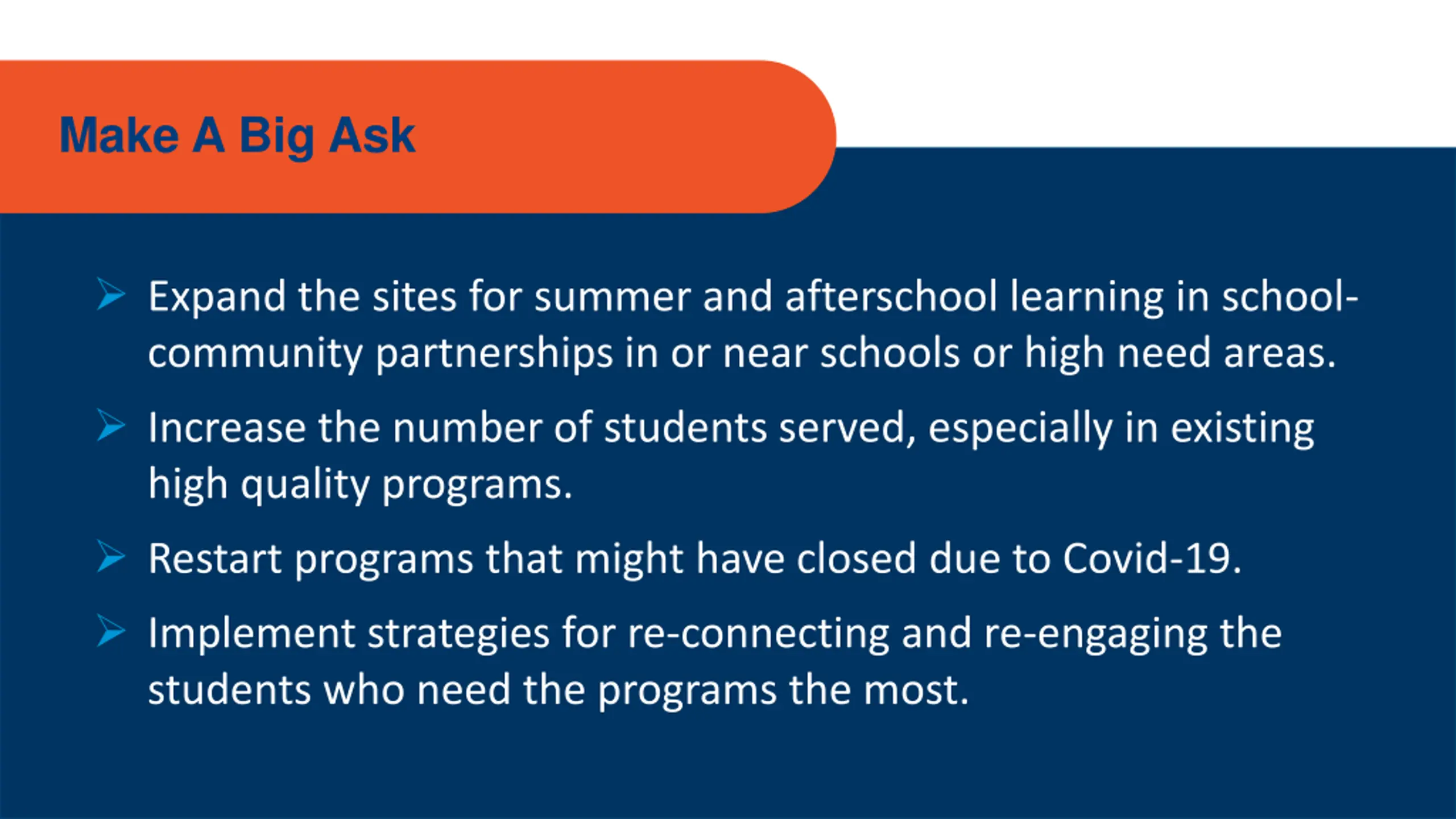 Make A Big Ask Expand the sites for summer and afterschool learning in school- community partnerships in or near schools or high need areas. Increase the number of students served, especially in existing high quality programs. Restart programs that might have closed due to Covid-19. Implement strategies for re-connecting and re-engaging the students who need the programs the most.
