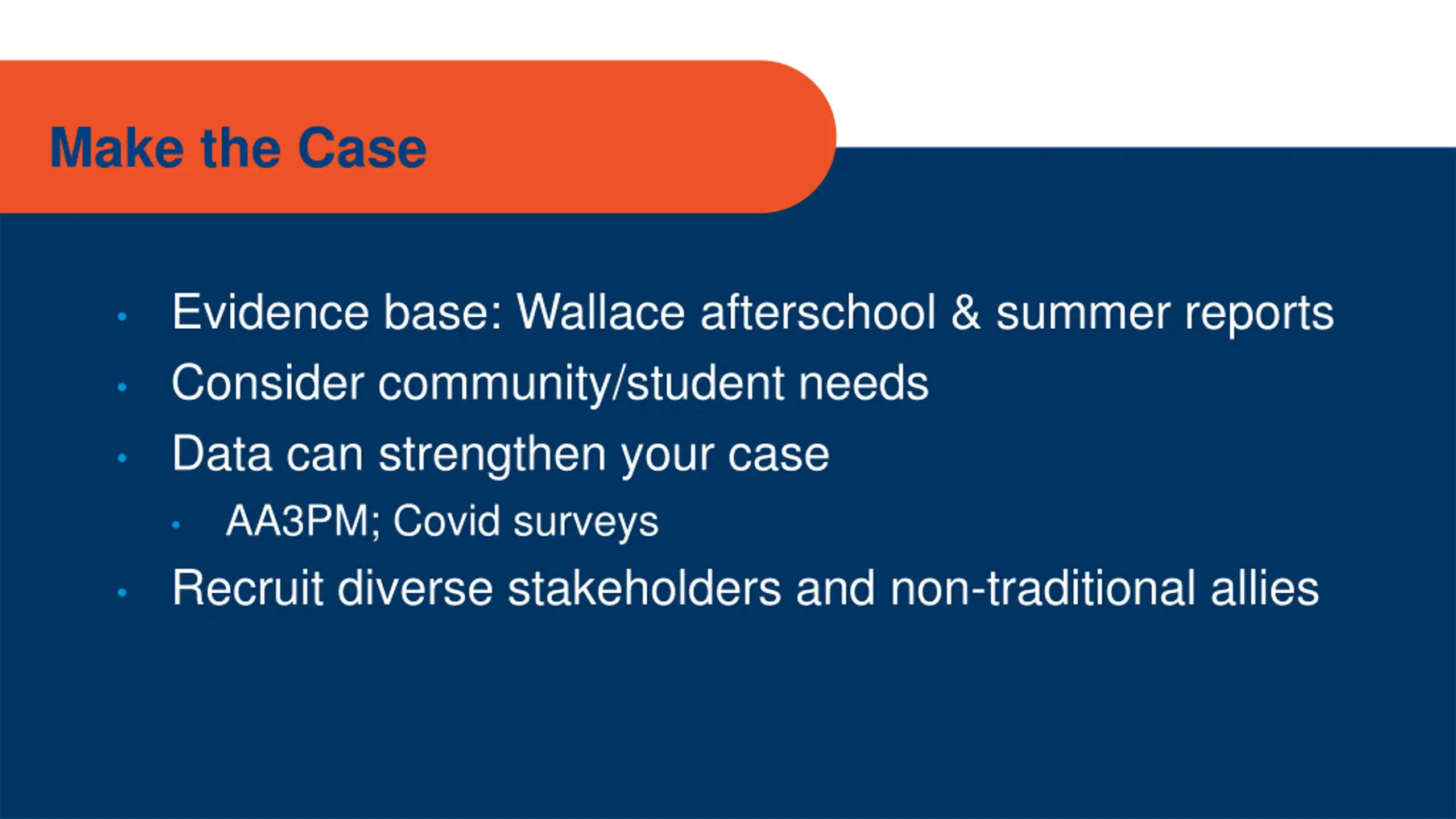 Make the Case Evidence base: Wallace afterschool & summer reports Consider community/student needs Data can strengthen your case AA3PM; Covid surveys Recruit diverse stakeholders and non-traditional allies