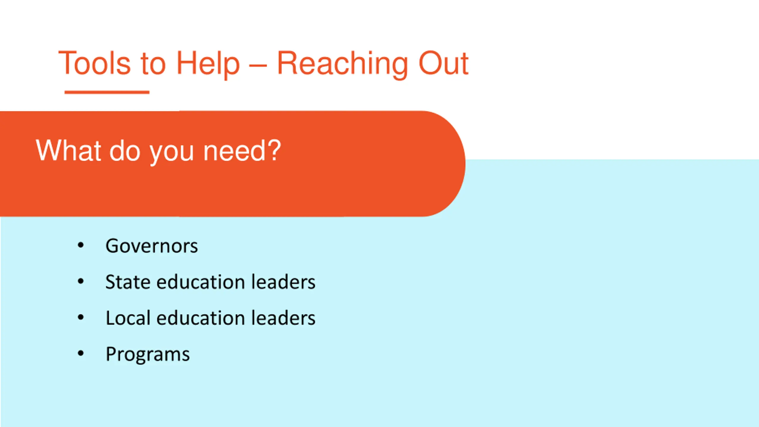 Tools to Help Reaching Out What do you need? Governors State education leaders Local education leaders Programs