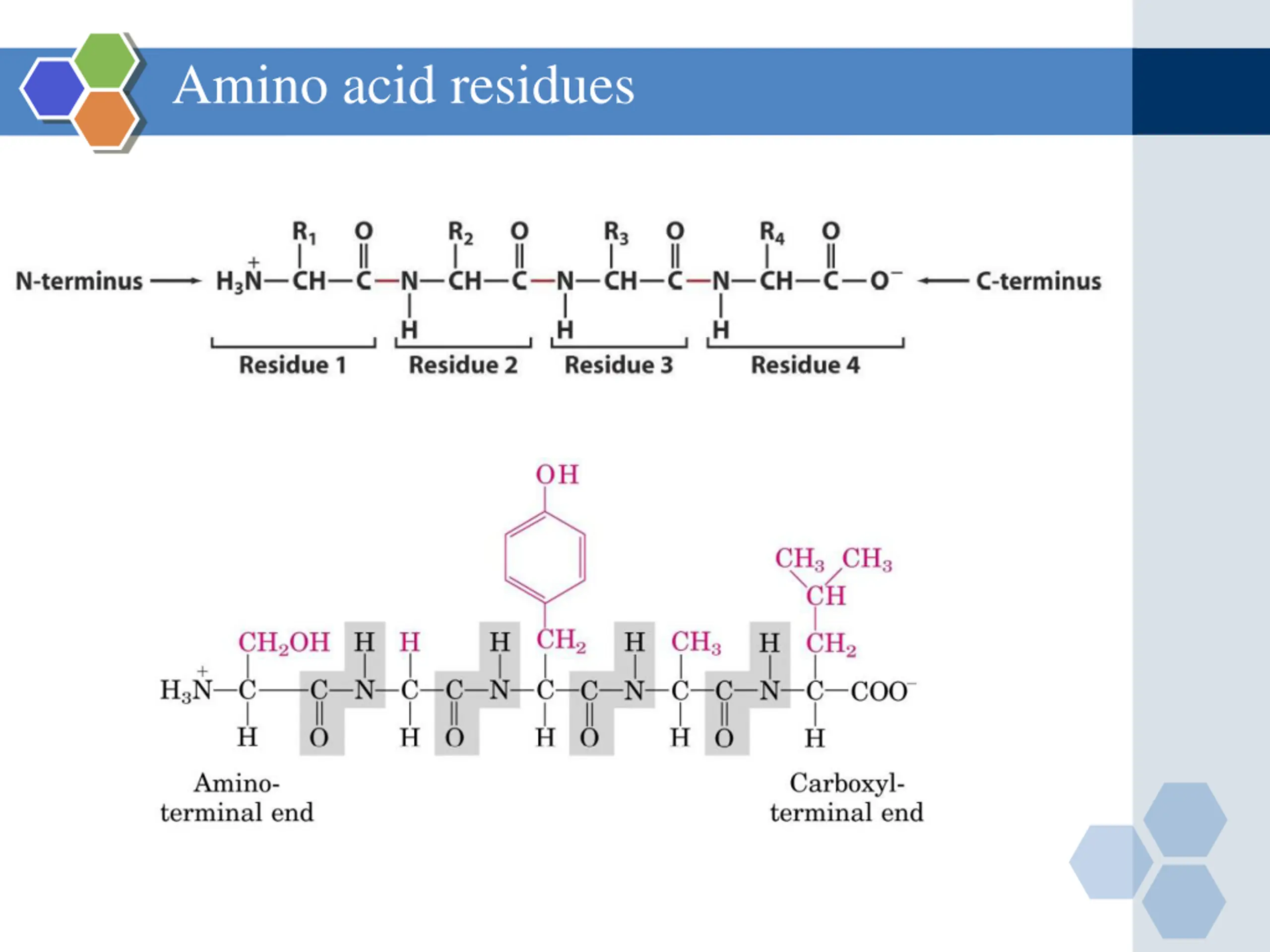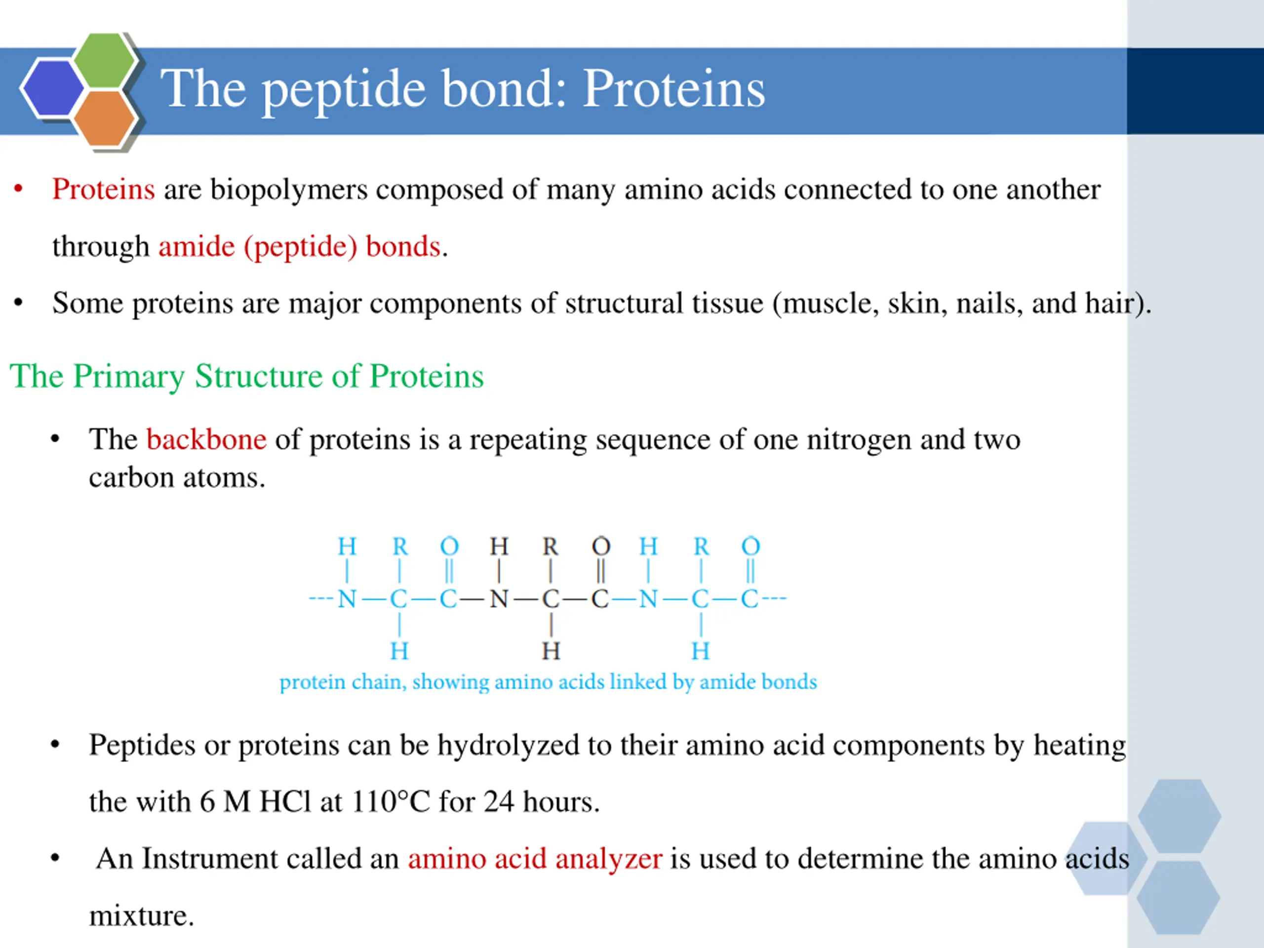 The peptide bond: Proteins Proteins are biopolymers composed of many amino acids connected to one another through amide (peptide) bonds. Some proteins are major components of structural tissue (muscle, skin, nails, and hair). The Primary Structure of Proteins The backbone of proteins is a repeating sequence of one nitrogen and two carbon atoms. Peptides or proteins can be hydrolyzed to their amino acid components by heating the with 6 M HCl at 110 C for 24 hours. An Instrument called an amino acid analyzer is used to determine the amino acids mixture.