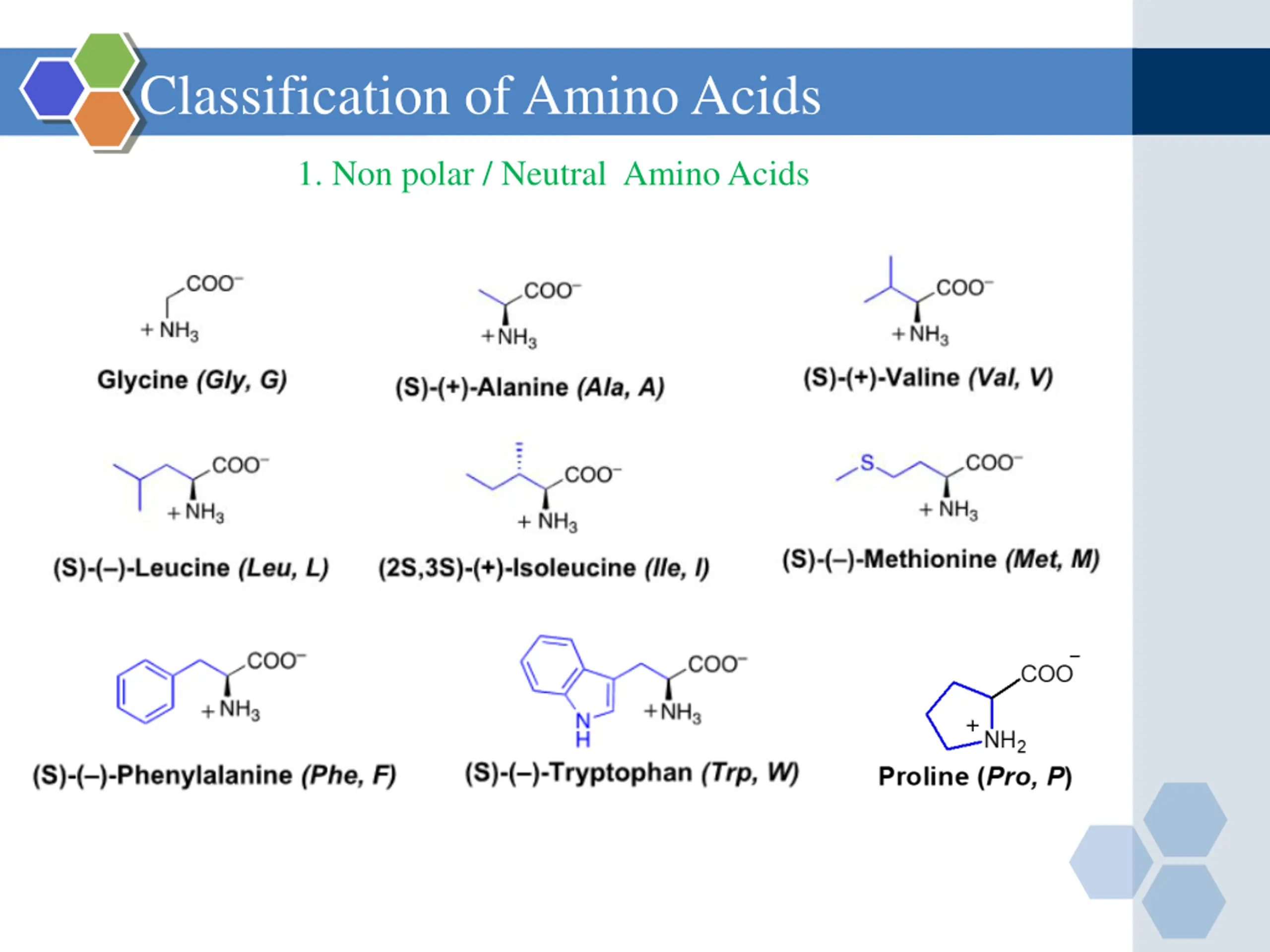 Classification of Amino Acids 1. Non polar / Neutral Amino Acids