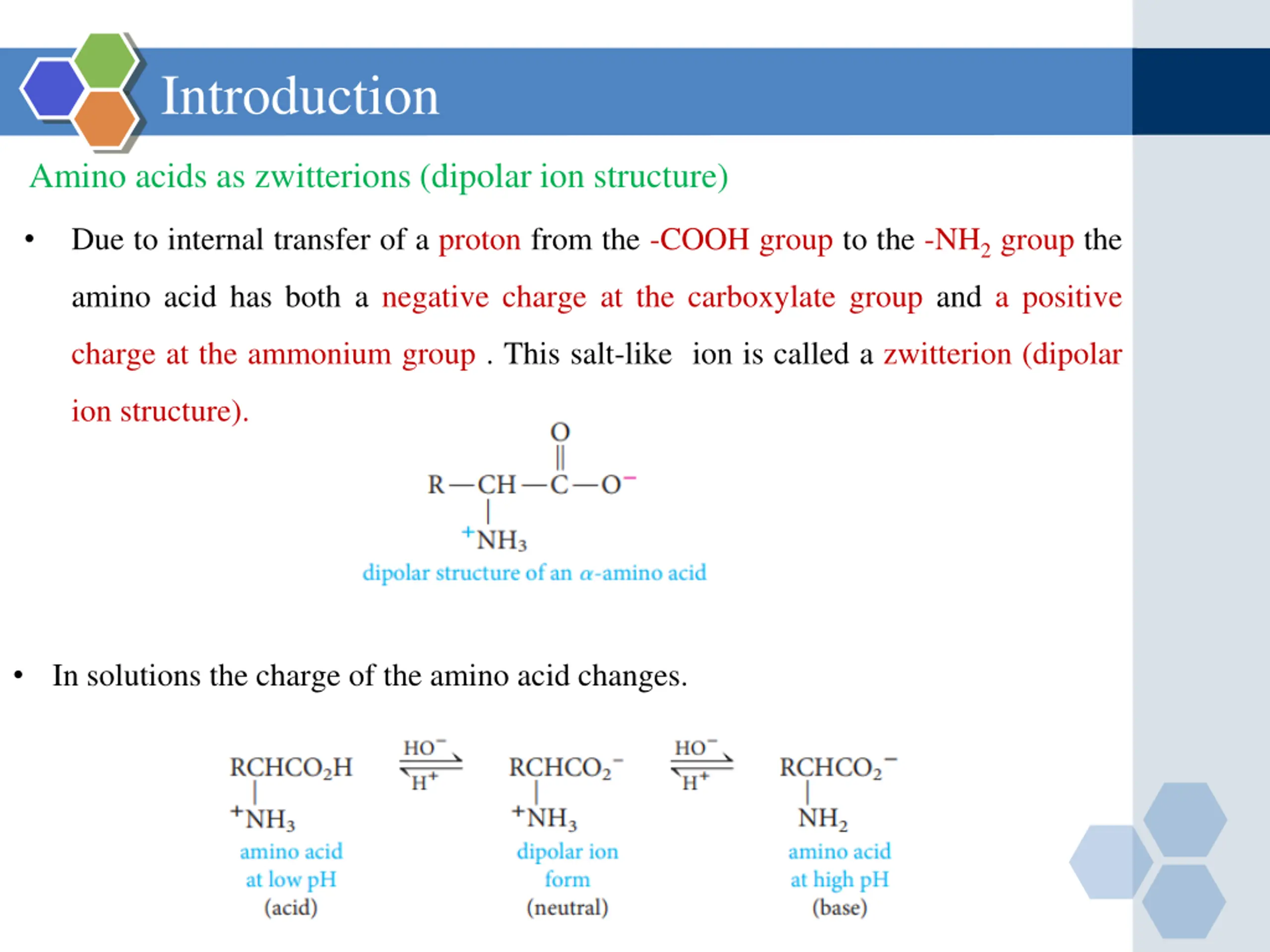 Introduction Amino acids as zwitterions (dipolar ion structure) Due to internal transfer of a proton from the -COOH group to the -NH2 group the amino acid has both a negative charge at the carboxylate group and a positive charge at the ammonium group . This salt-like ion is called a zwitterion (dipolar ion structure). In solutions the charge of the amino acid changes.