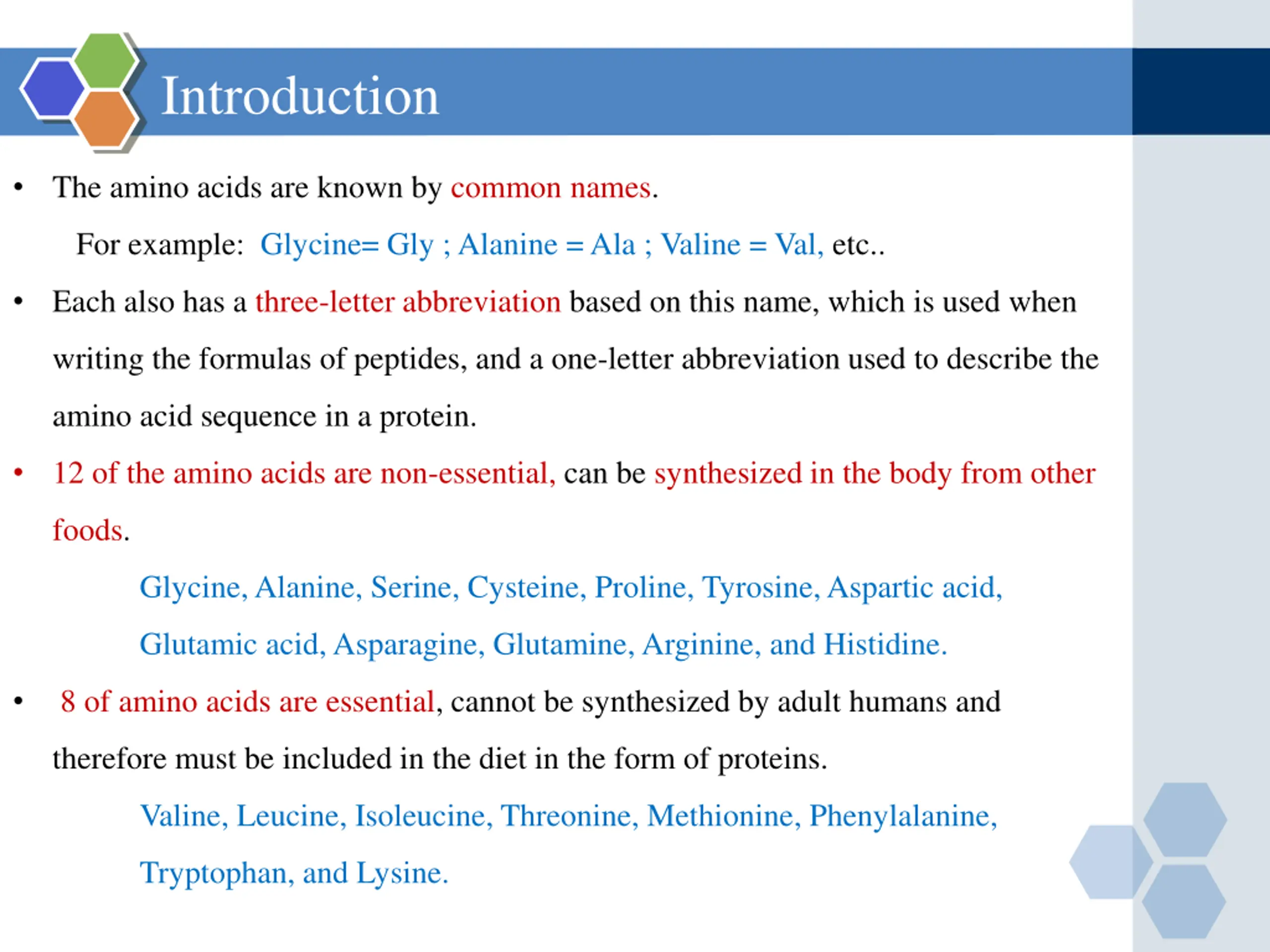 Introduction The amino acids are known by common names. For example: Glycine= Gly ; Alanine = Ala ; Valine = Val, etc.. Each also has a three-letter abbreviation based on this name, which is used when writing the formulas of peptides, and a one-letter abbreviation used to describe the amino acid sequence in a protein. 12 of the amino acids are non-essential, can be synthesized in the body from other foods. Glycine, Alanine, Serine, Cysteine, Proline, Tyrosine, Aspartic acid, Glutamic acid, Asparagine, Glutamine, Arginine, and Histidine. 8 of amino acids are essential, cannot be synthesized by adult humans and therefore must be included in the diet in the form of proteins. Valine, Leucine, Isoleucine, Threonine, Methionine, Phenylalanine, Tryptophan, and Lysine.