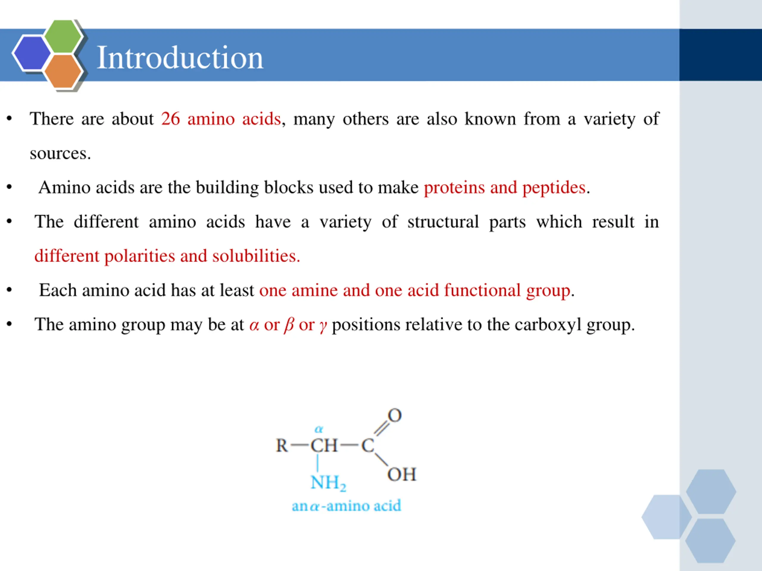 Introduction There are about 26 amino acids, many others are also known from a variety of sources. Amino acids are the building blocks used to make proteins and peptides. The different amino acids have a variety of structural parts which result in different polarities and solubilities. Each amino acid has at least one amine and one acid functional group. The amino group may be at or or positions relative to the carboxyl group.