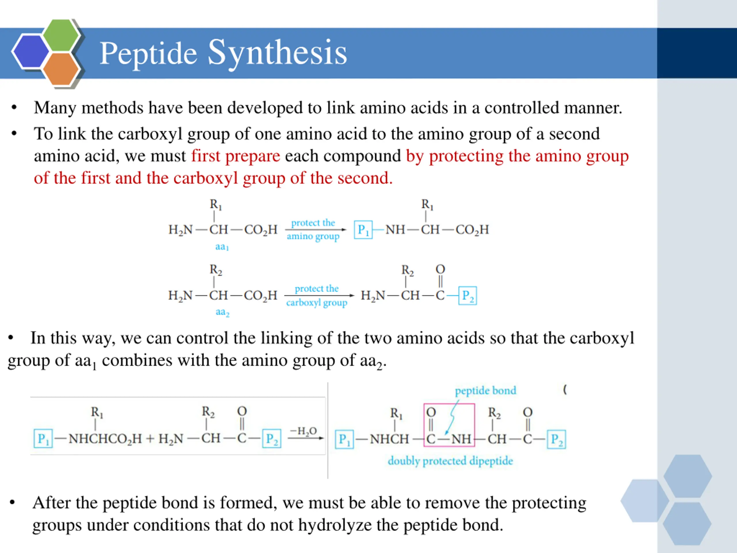 Peptide Synthesis Many methods have been developed to link amino acids in a controlled manner. To link the carboxyl group of one amino acid to the amino group of a second amino acid, we must first prepare each compound by protecting the amino group of the first and the carboxyl group of the second. In this way, we can control the linking of the two amino acids so that the carboxyl group of aa1 combines with the amino group of aa2. After the peptide bond is formed, we must be able to remove the protecting groups under conditions that do not hydrolyze the peptide bond.