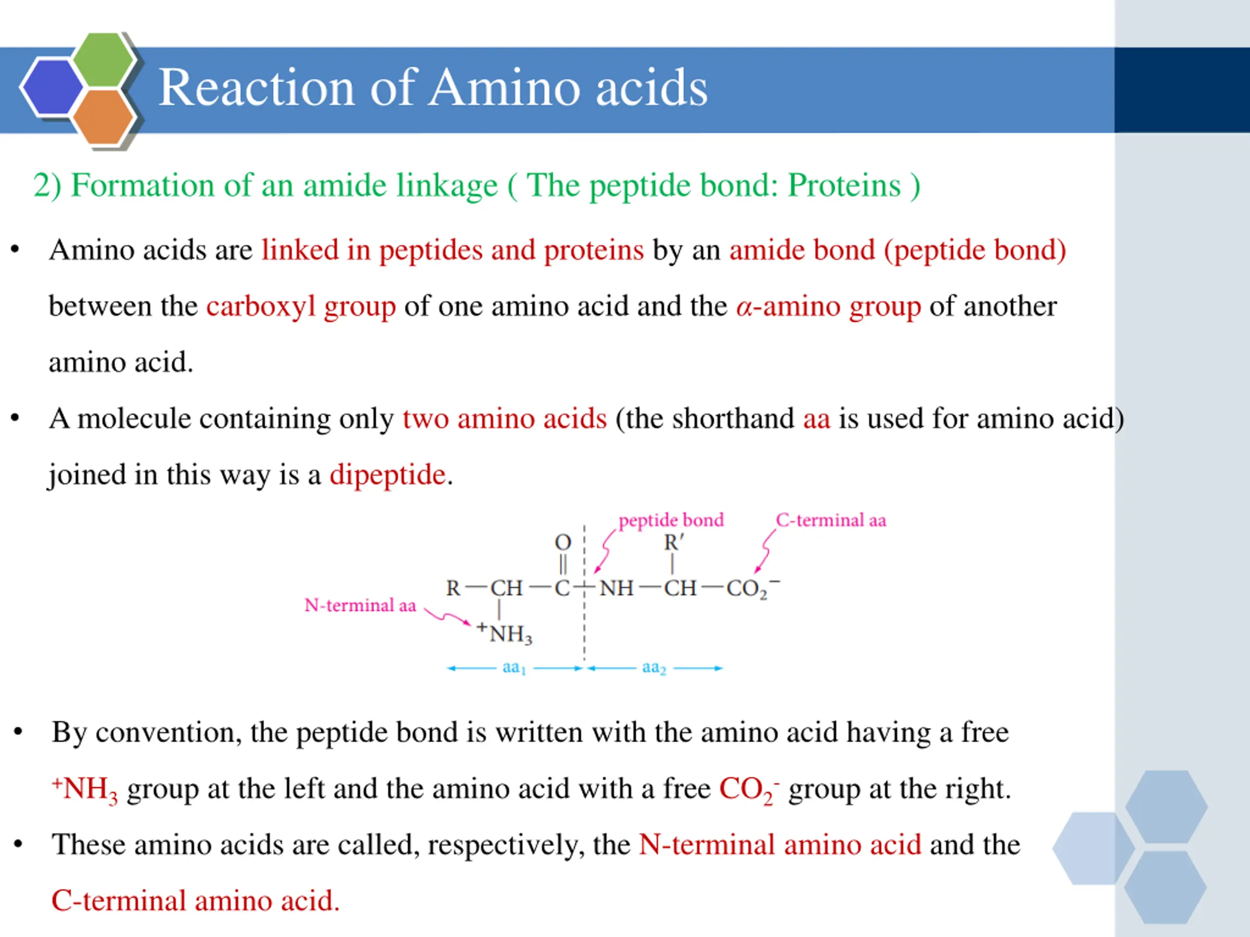 Reaction of Amino acids 2) Formation of an amide linkage ( The peptide bond: Proteins ) Amino acids are linked in peptides and proteins by an amide bond (peptide bond) between the carboxyl group of one amino acid and the -amino group of another amino acid. A molecule containing only two amino acids (the shorthand aa is used for amino acid) joined in this way is a dipeptide. By convention, the peptide bond is written with the amino acid having a free +NH3 group at the left and the amino acid with a free CO2- group at the right. These amino acids are called, respectively, the N-terminal amino acid and the C-terminal amino acid.