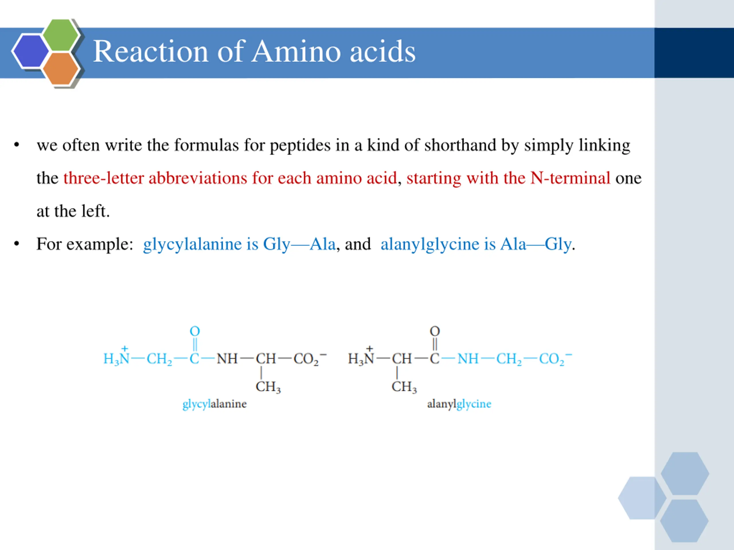 Reaction of Amino acids we often write the formulas for peptides in a kind of shorthand by simply linking the three-letter abbreviations for each amino acid, starting with the N-terminal one at the left. For example: glycylalanine is Gly Ala, and alanylglycine is Ala Gly.