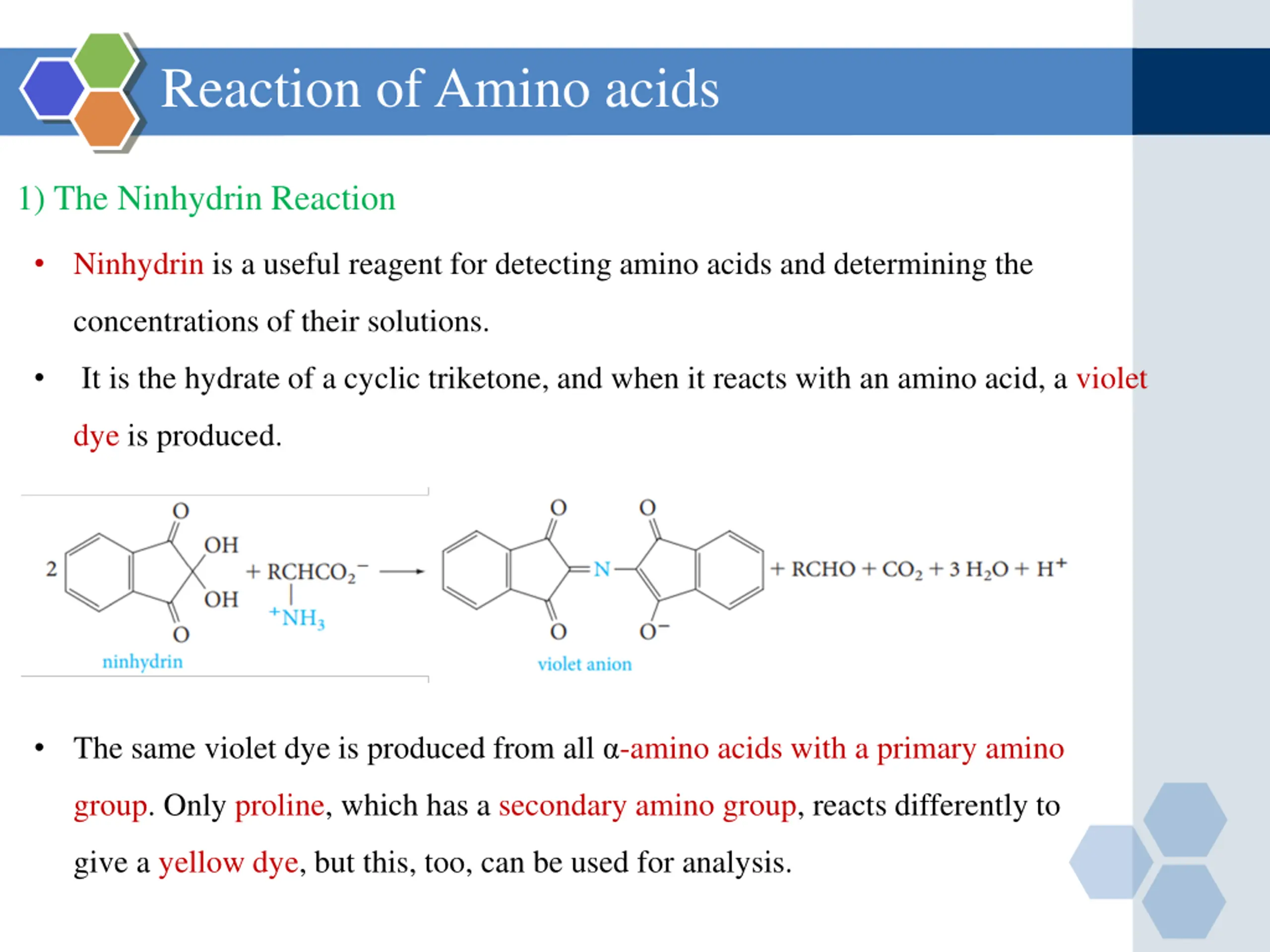 Reaction of Amino acids 1) The Ninhydrin Reaction Ninhydrin is a useful reagent for detecting amino acids and determining the concentrations of their solutions. It is the hydrate of a cyclic triketone, and when it reacts with an amino acid, a violet dye is produced. The same violet dye is produced from all -amino acids with a primary amino group. Only proline, which has a secondary amino group, reacts differently to give a yellow dye, but this, too, can be used for analysis.