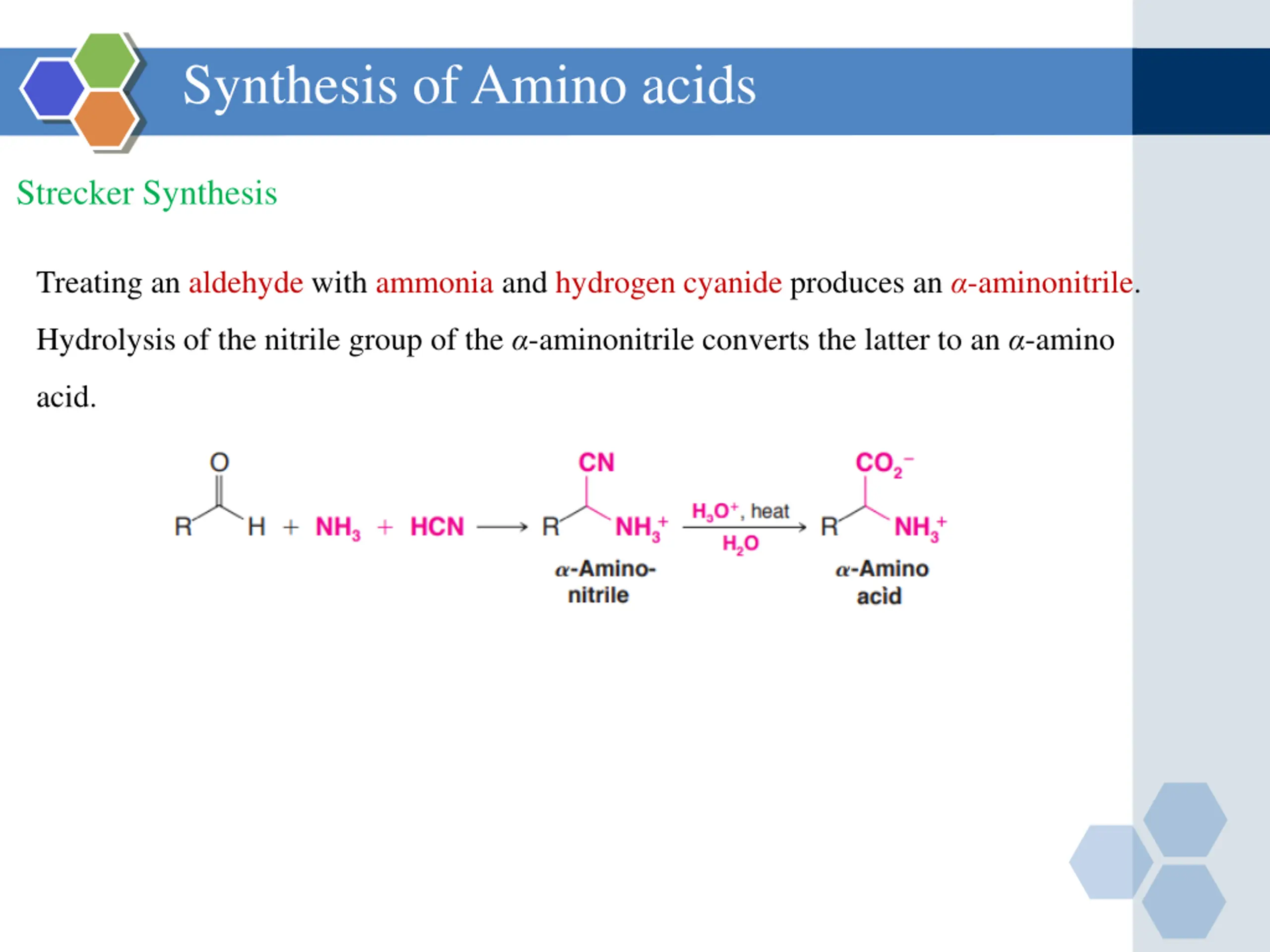 Synthesis of Amino acids Strecker Synthesis Treating an aldehyde with ammonia and hydrogen cyanide produces an -aminonitrile. Hydrolysis of the nitrile group of the -aminonitrile converts the latter to an -amino acid.