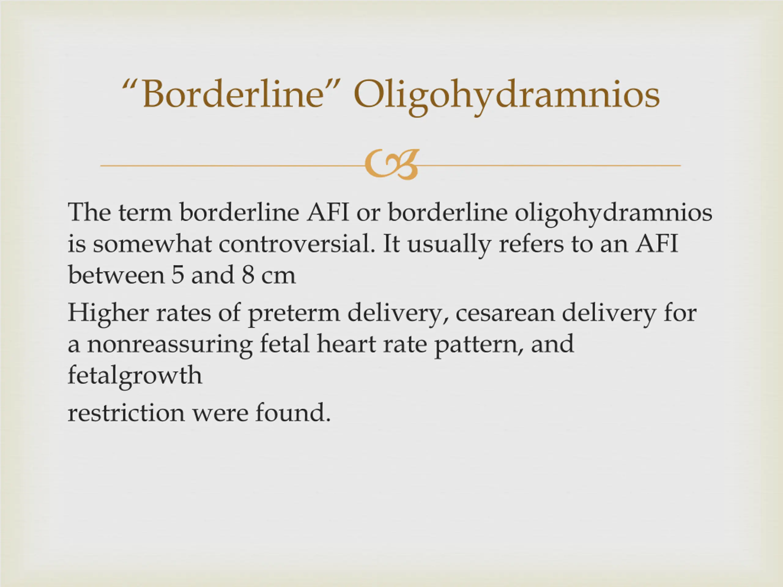 Borderline Oligohydramnios The term borderline AFI or borderline oligohydramnios is somewhat controversial. It usually refers to an AFI between 5 and 8 cm Higher rates of preterm delivery, cesarean delivery for a nonreassuring fetal heart rate pattern, and fetalgrowth restriction were found.